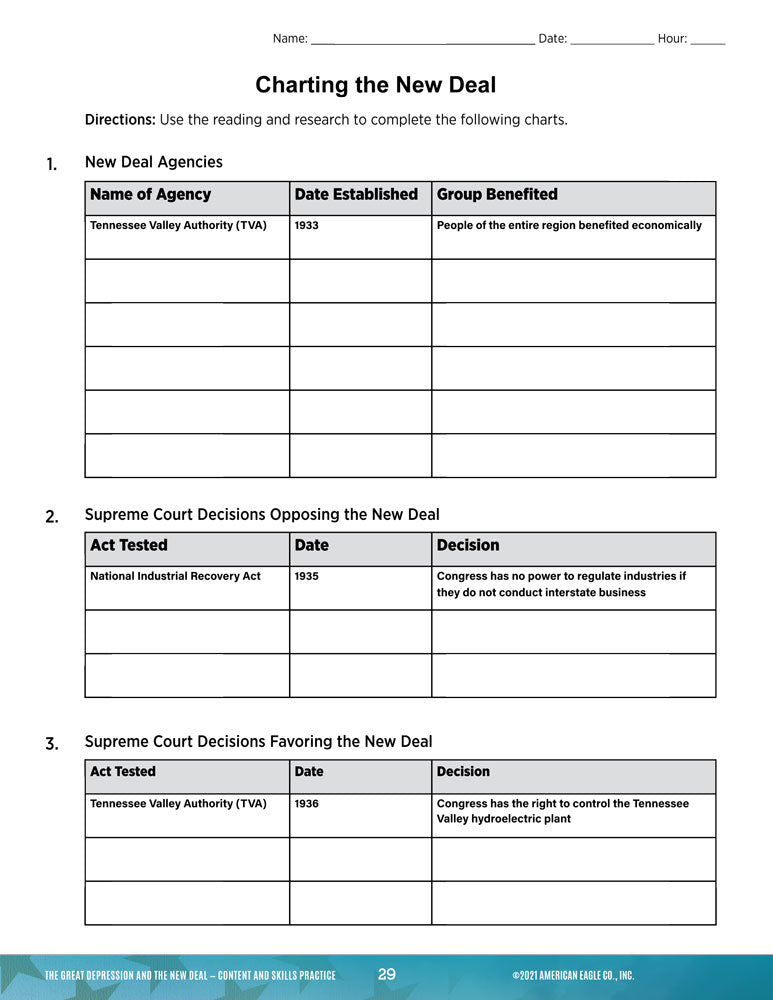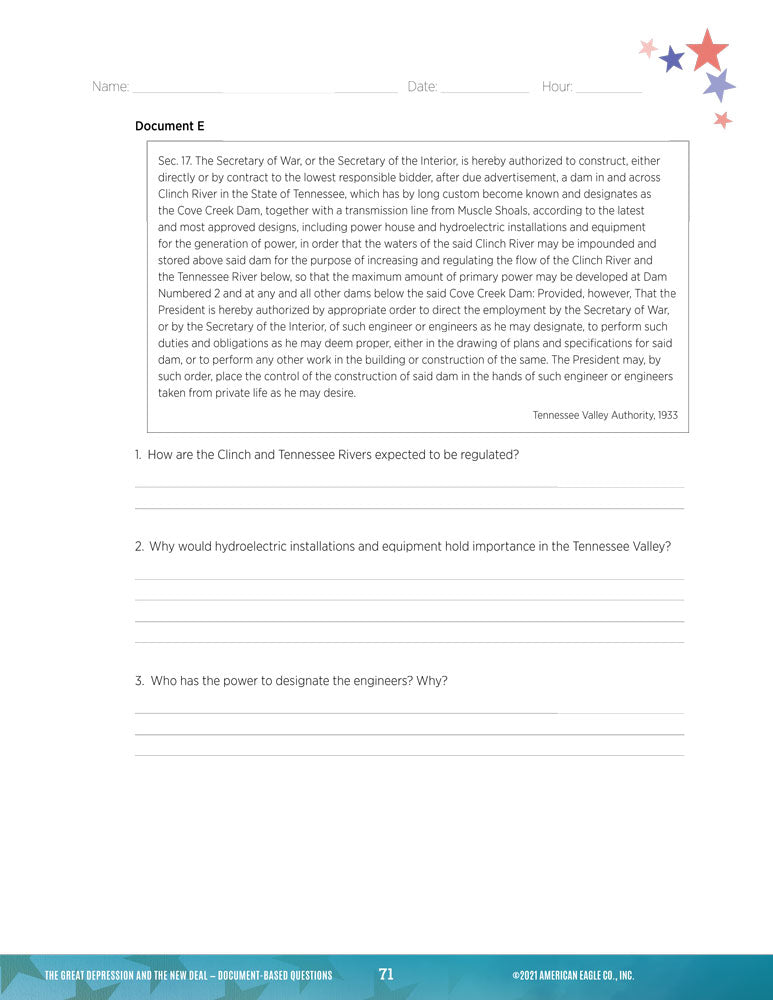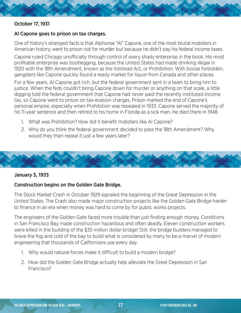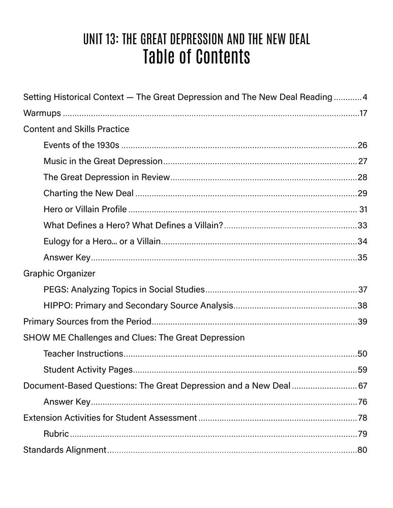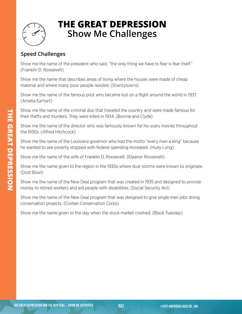 - Activities include: Hero or Villain? Profile, SHOW ME Challenges and Clues: The Great Depression, and Document-Based Questions: The Great Depression and a New Deal.