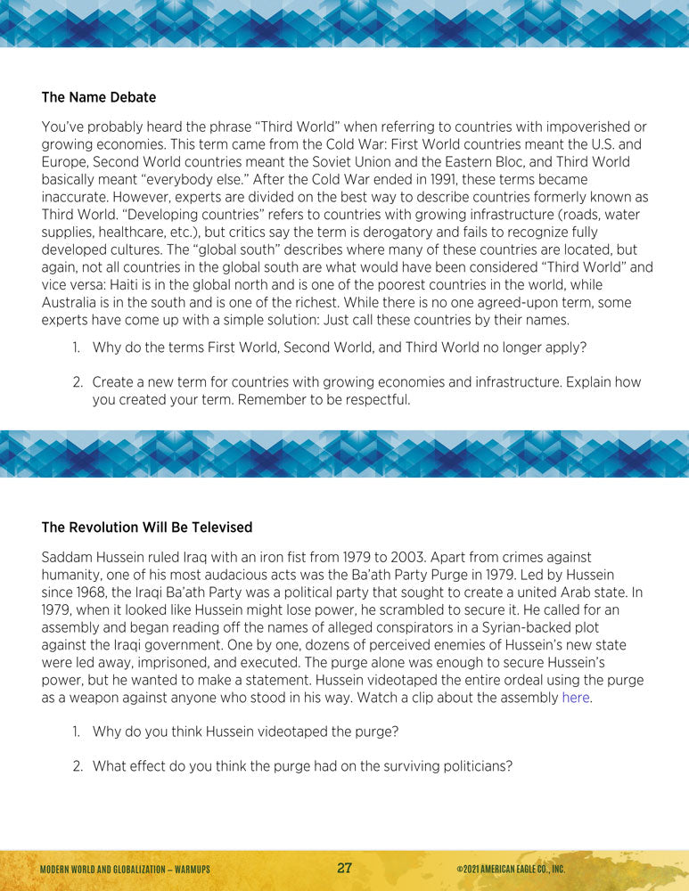 - Activities include: Hero or Villain blank poster and activity, Country Profile activity, Easy Debate: Should Nations Intervene in African Genocidal Conflicts Such as in Rwanda and Sudan?, Show Me Challenges and Clues on Modern World Events, and Document-Based Questions on the Modern World.