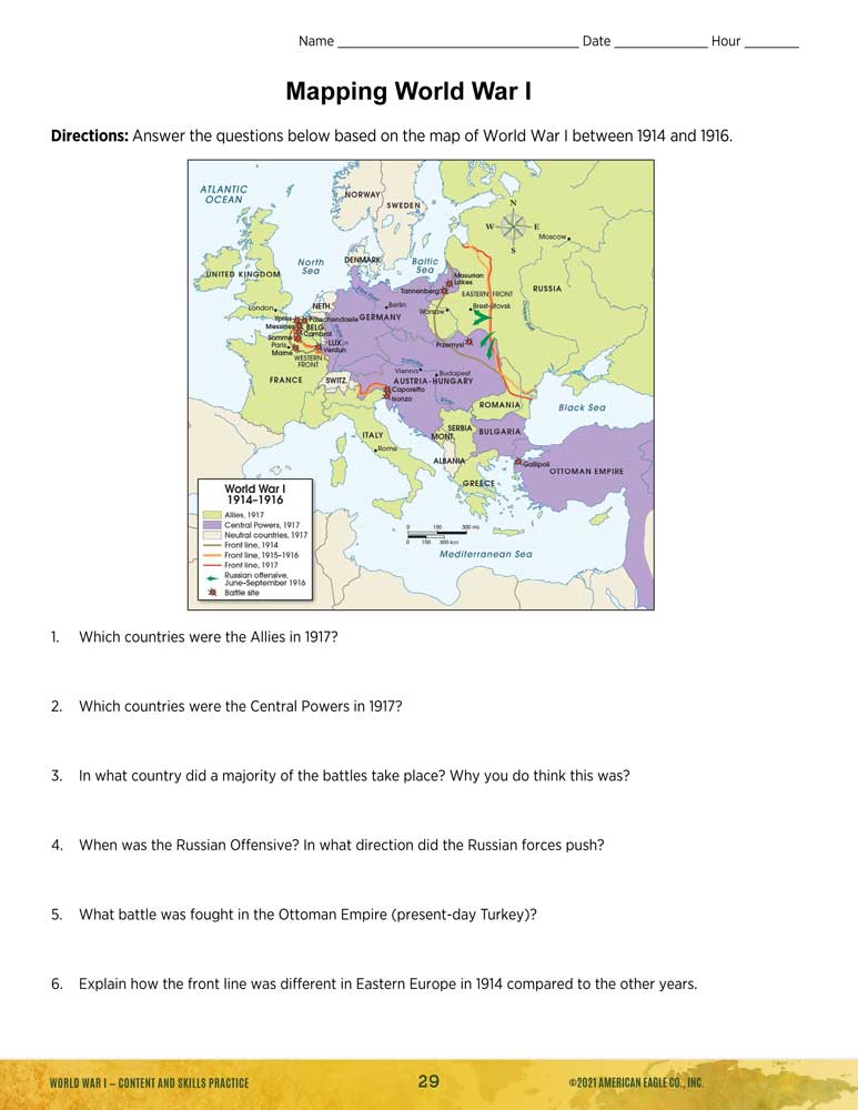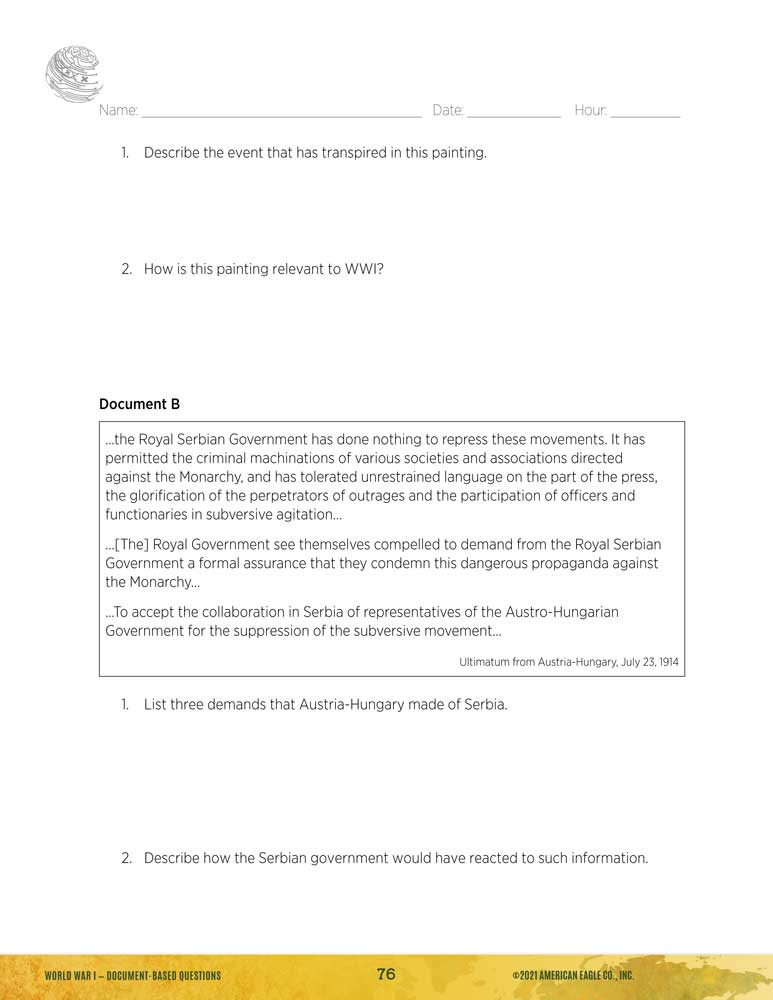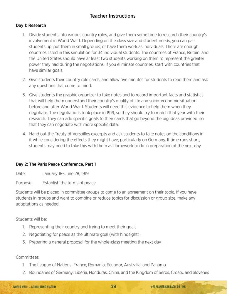 - Activities include: “FARCE” book activities, Stimulating History: Paris Peace Conference Simulation, and Document-Based Questions on World War I.