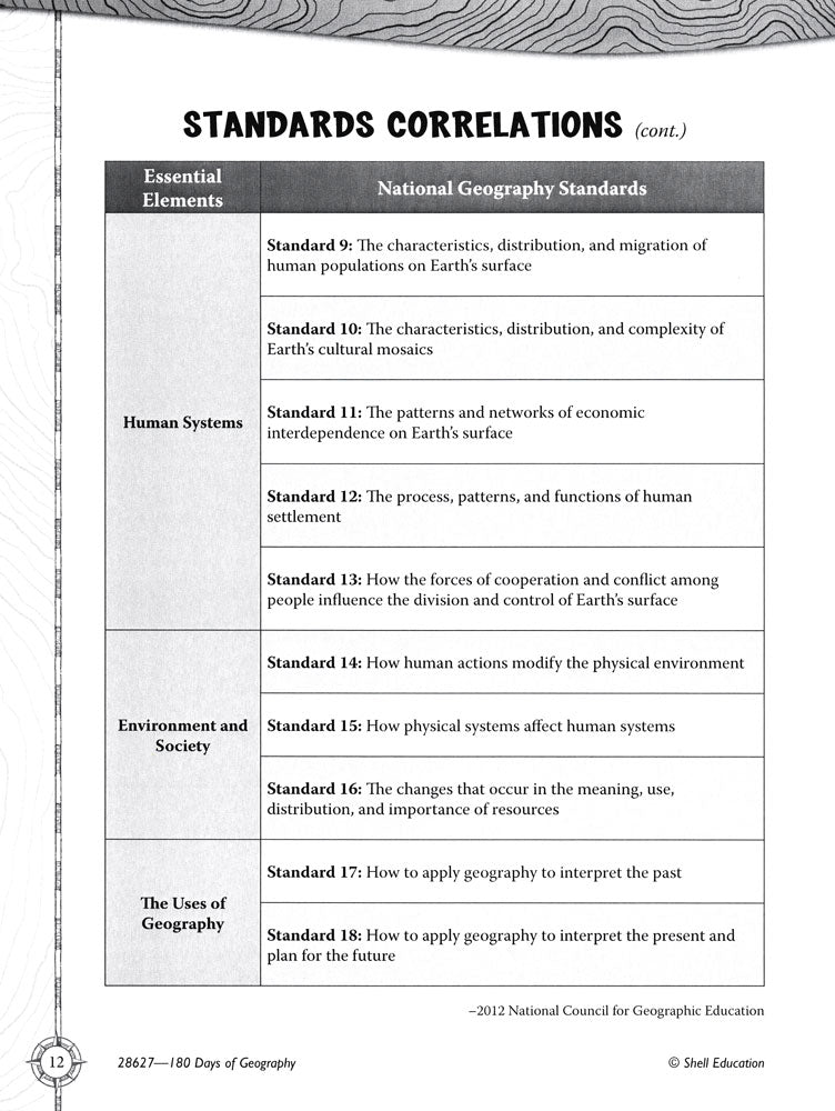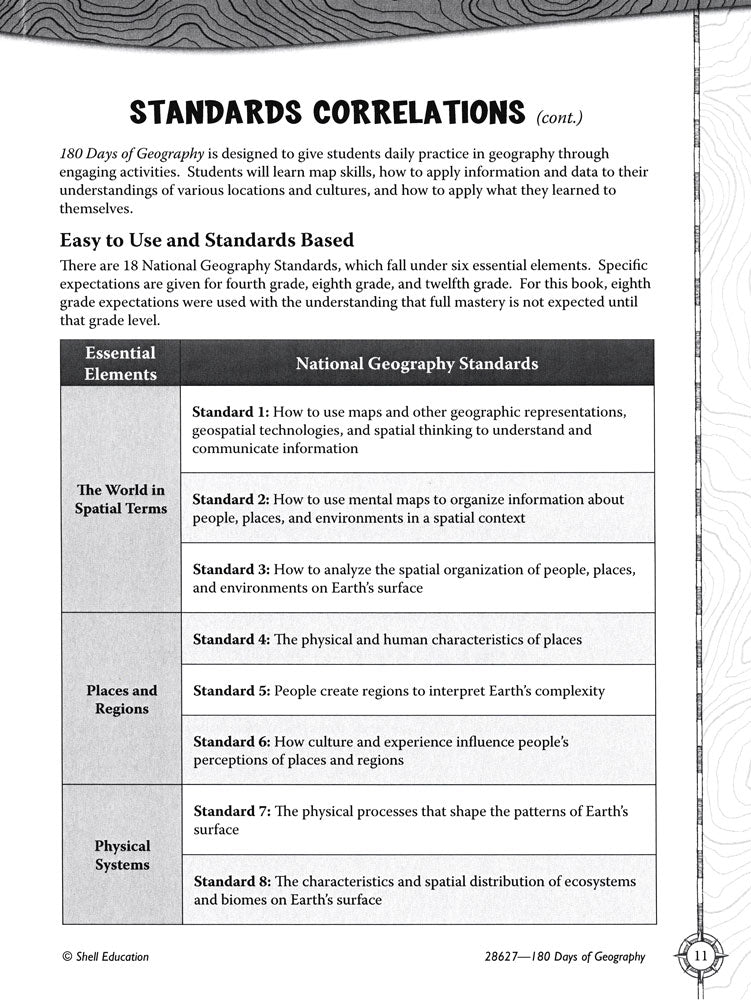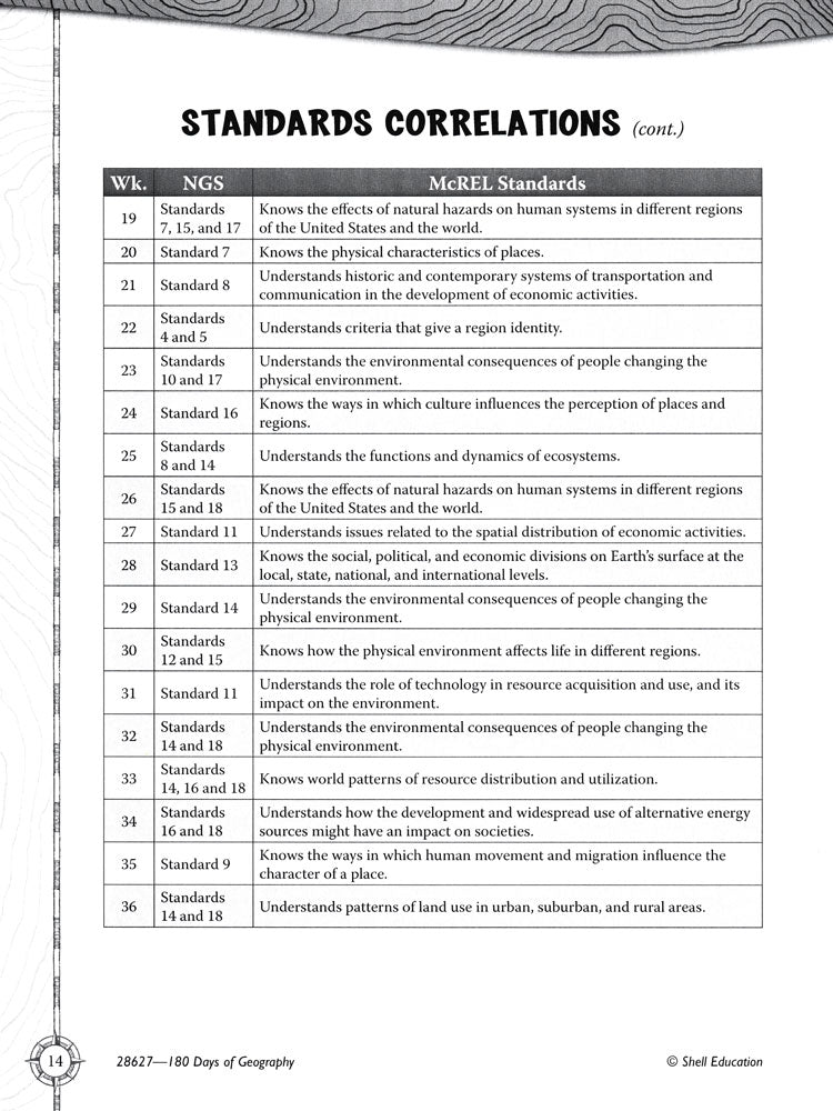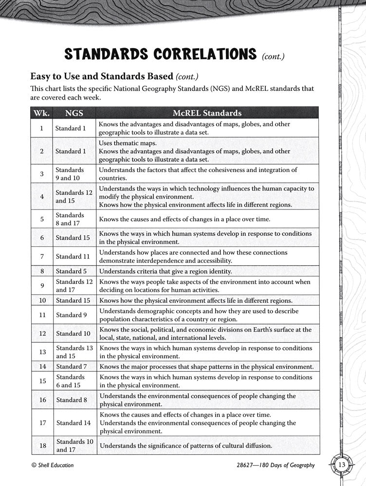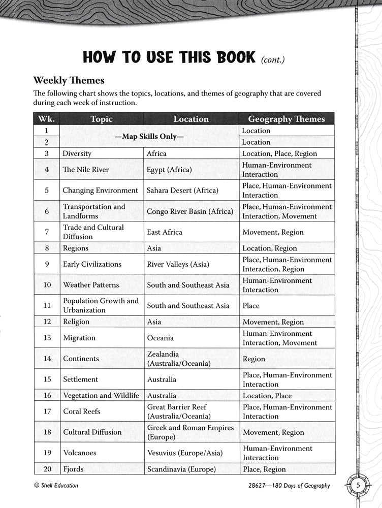 Build mastery of sixth-grade geography skills with quick and purposeful daily practice! Organized by week, each section in the book focuses on one geography topic and location. Students analyze maps, texts, and visual information as they explore the five themes of geography. They also learn key maps skills and make personal connections to the locations for a lasting effect. This practical resource includes: