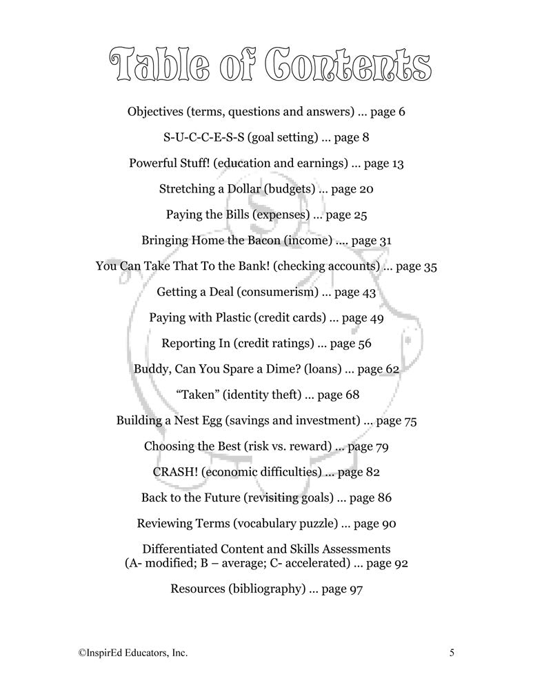 This standards-based book contains activities on goal setting, education and earnings, budgets, expenses, credit, loans, identity theft, savings and investment, economic difficulties, and more.