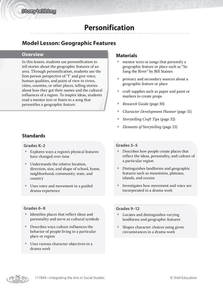 Students tell the “untold” story from an event, compose a song or poem, and make works of art to understand Social Studies topics. This teacher’s guide shows you how to enrich your students’ Social Studies experience with creative arts activities.
