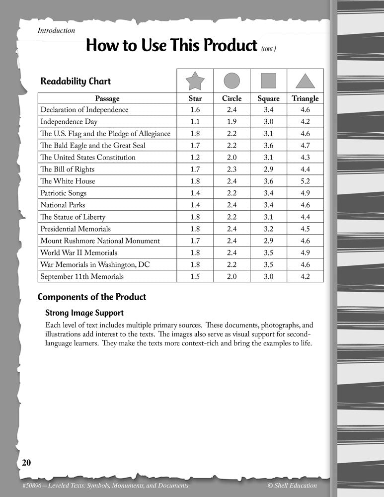 Designed to fully engage and motivate students in grades 1–8, this resource is perfect for differentiating social studies instruction. This book includes 15 different topics including the Declaration of Independence, the Bill of Rights, National Parks, Presidential Monuments, War Memorials, the Bald Eagle, the Great Seal, and more at four different reading levels: 1.5–2.2, 3.0–3.5, 5.0–5.5, and 6.5–7.2. Each topic features high-interest text with matching pictures with symbols placed in the lower corner of each page represent the reading level range and are designed to help teachers differentiate instruction. Comprehension questions are also provided to complement each reading level.