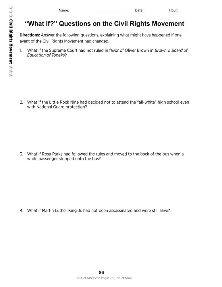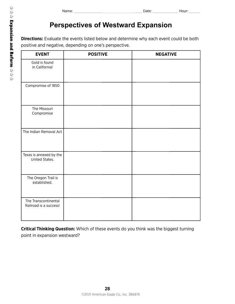 Expand your teaching arsenal with primary sources, maps, graphic organizers, timelines, research projects, critical thinking prompts, and creative writing activities ALL IN ONE BOOK! Activities span U.S. History from pre-1763 through the contemporary era. Generate strong student responses with differentiated learning activities that appeal to visual, verbal, and hands-on learners.