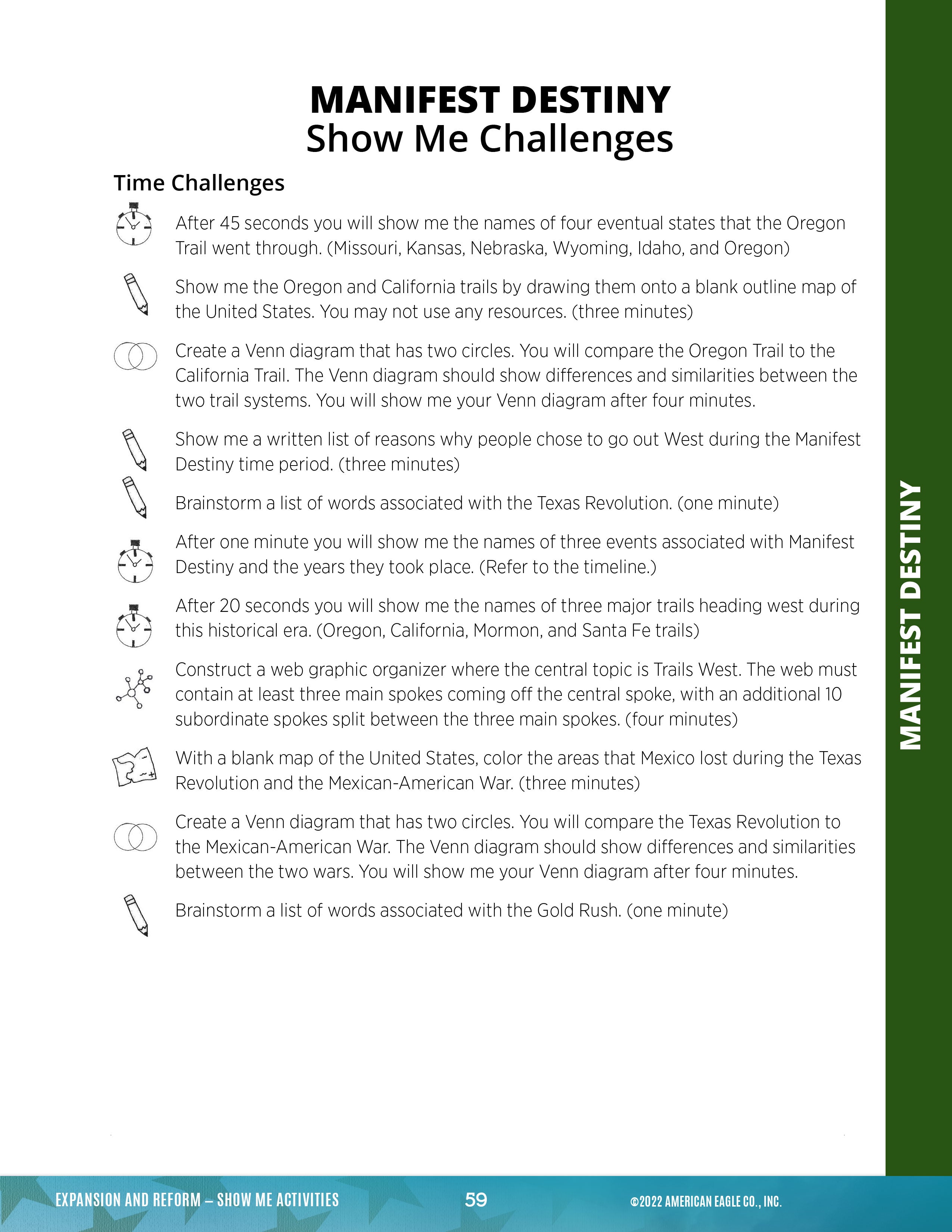 - Activities include: Easy Debate: Was Manifest Destiny a Positive Belief in American History?, SHOW ME Challenges and Clues: Manifest Destiny, Historical Speech Analysis of Frederick Douglass’ “The Meaning of July Fourth for the Negro,” and Document-Based Questions: The Race Wars Continue.