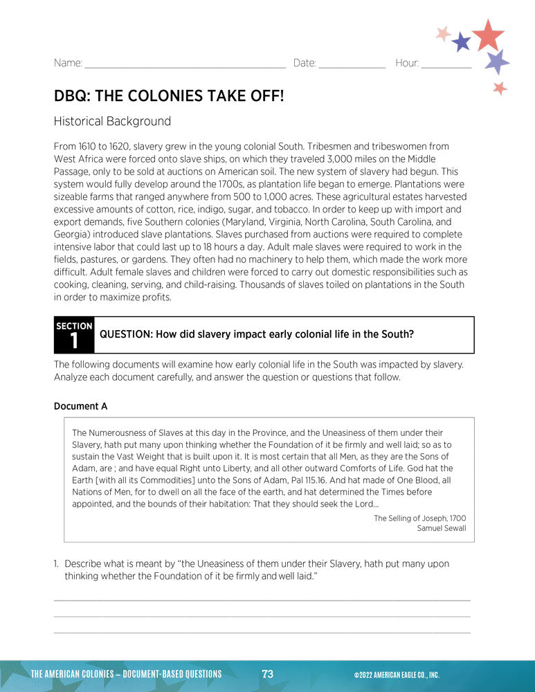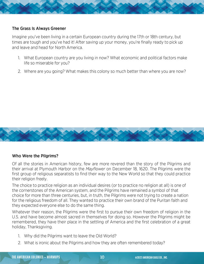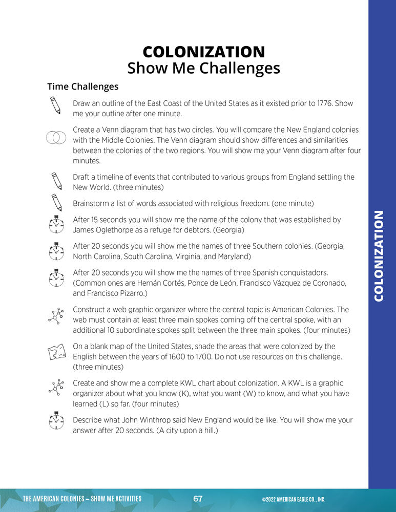 - Activities include: Easy Debate: Which Was the More Successful Colony: Jamestown or Plymouth?, SHOW ME Challenges and Clues: Colonization, and Document-Based Questions: The Colonies Take Off!