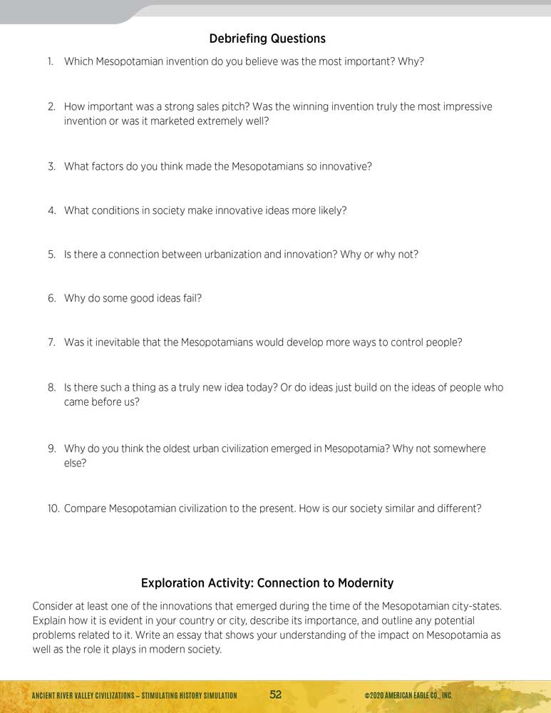 - Activities include: Stimulating History Simulation: Mesopotamian Inventions Trade Show, Prove It! Persuasion Station: Who Was the Most Significant Egyptian Pharaoh?, and Prove It! Persuasion Station: What Was Ancient China’s Greatest Contribution?