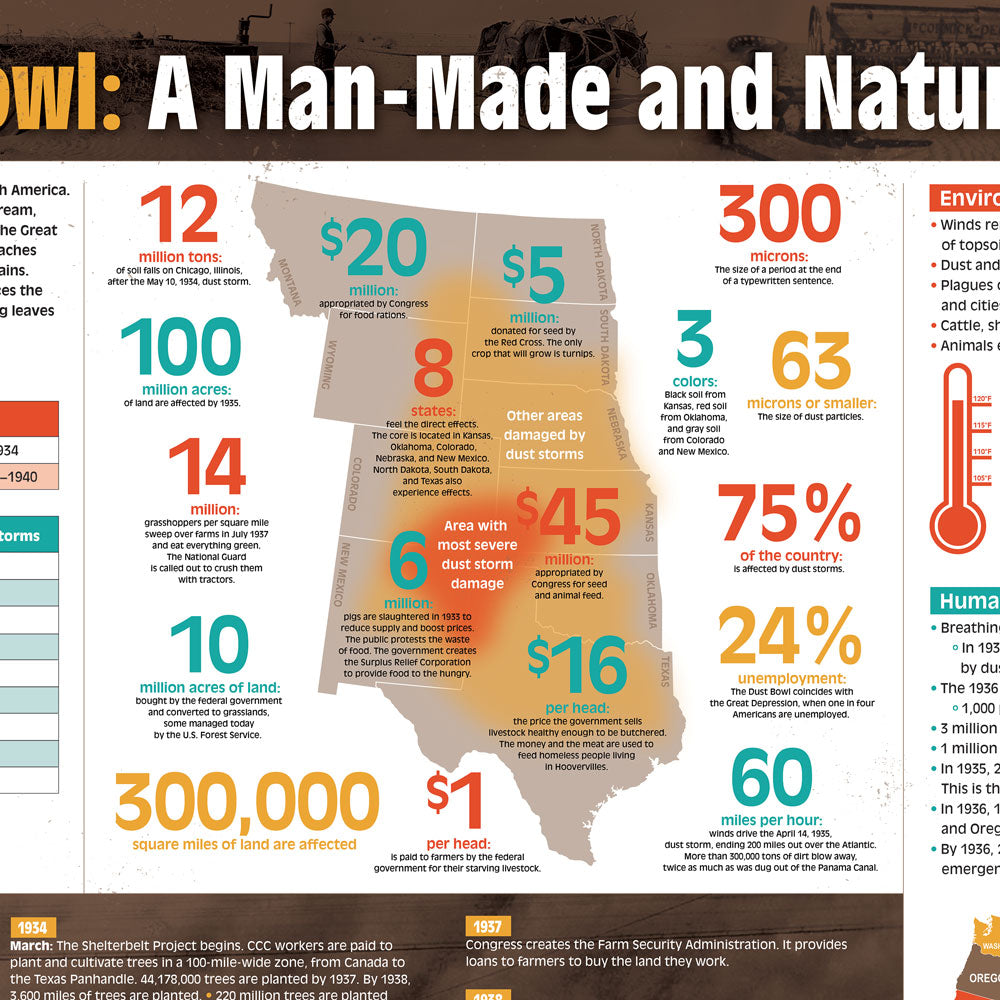The Dust Bowl and the Great Depression were the one-two punch of the 1930s. What caused the Dust Bowl? What happened to the people, and the environment? How did the government respond? The dynamic infographic is packed with facts about:
