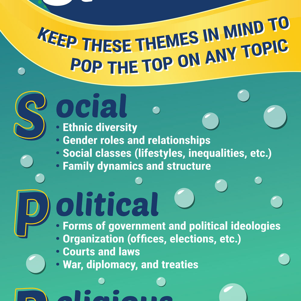 Students apply the six themes of SPRITE to break down and analyze the key factors of any historical or current event, civilization, or culture: