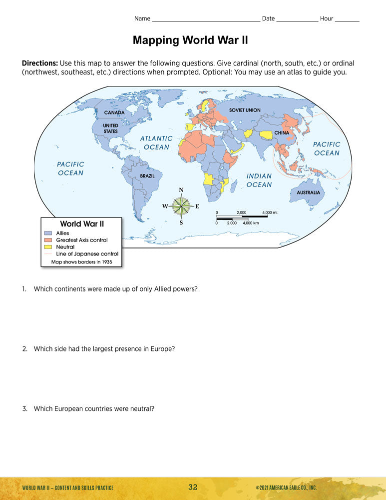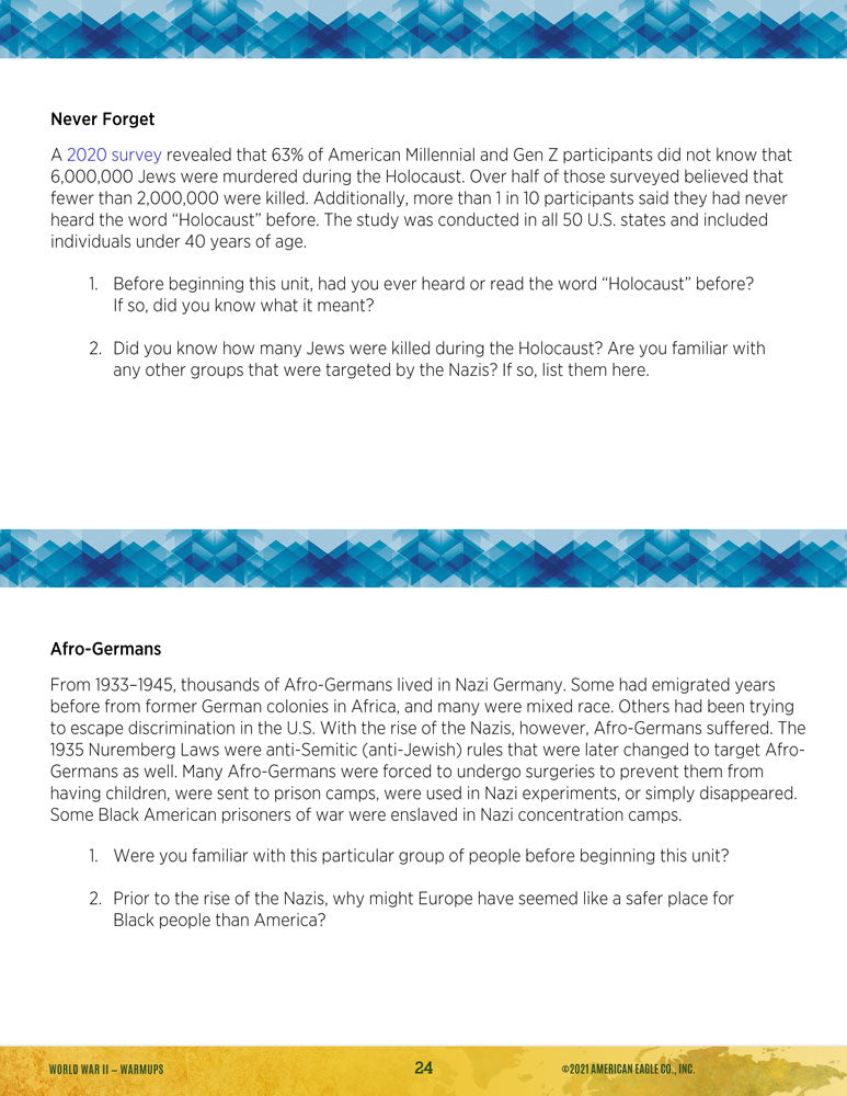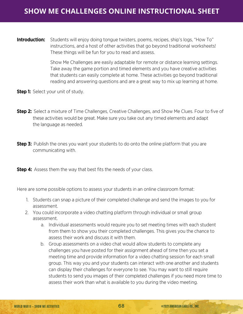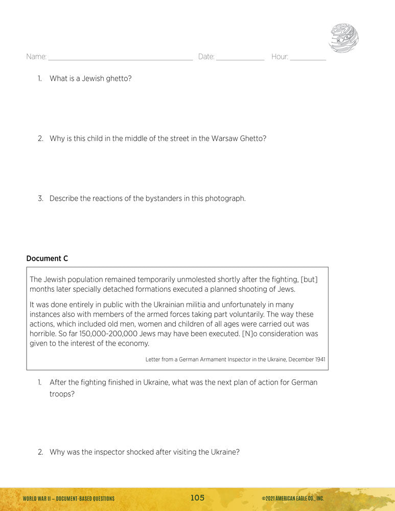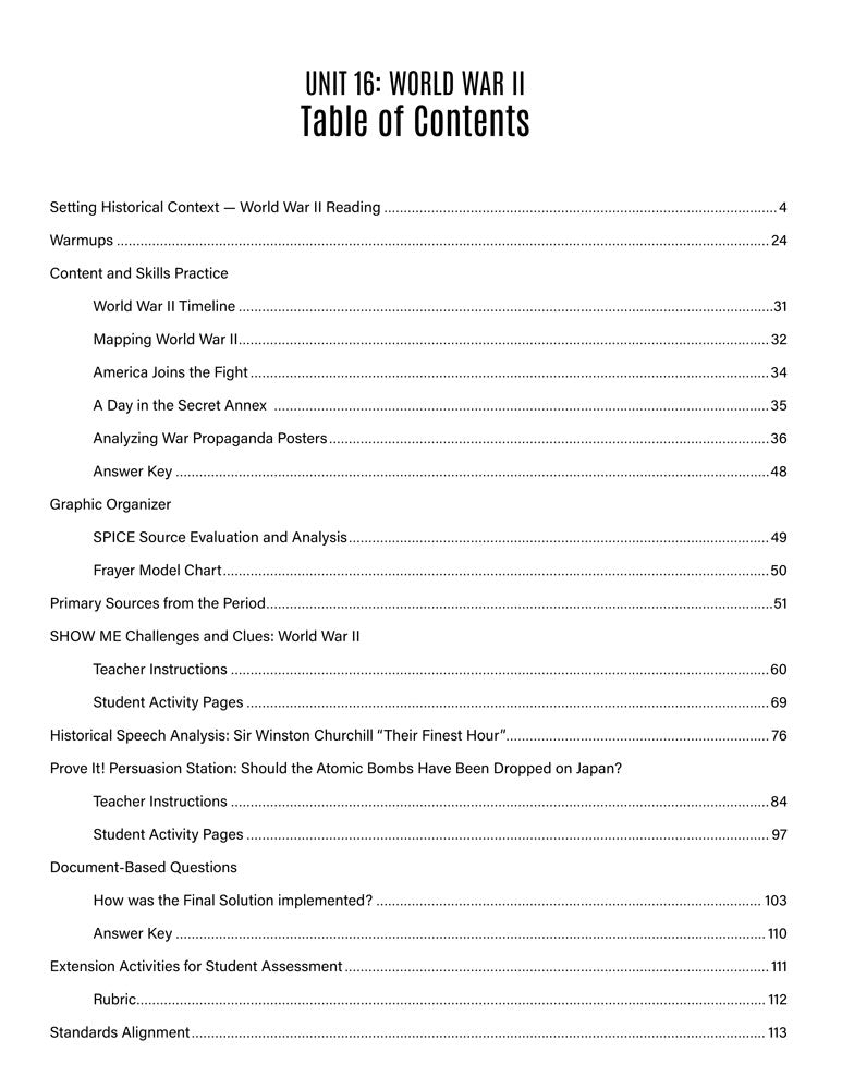 • Activities include: Show Me Challenges and Clues on World War II, Historical Speech Analysis: Sir Winston Churchill “Their Finest Hour,” and Document-Based Questions on the Holocaust.