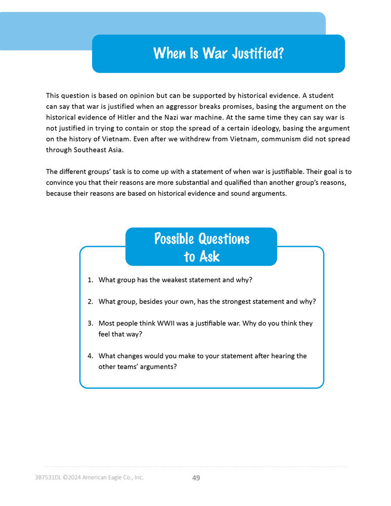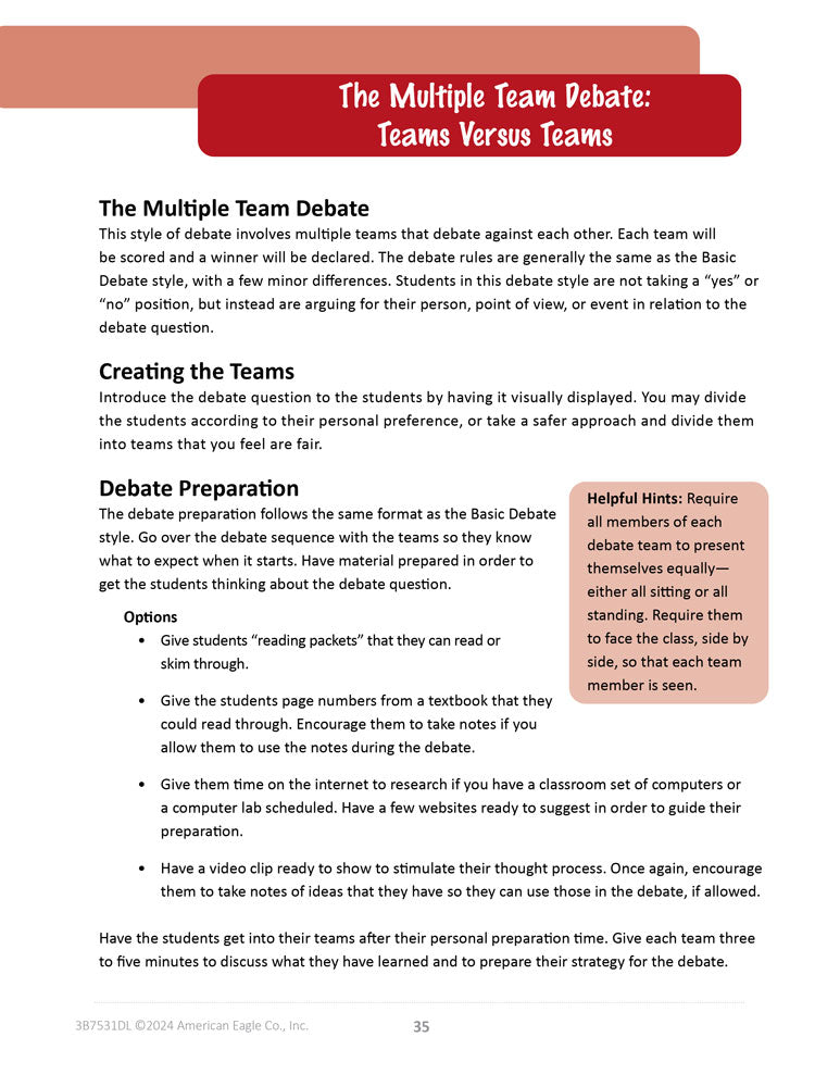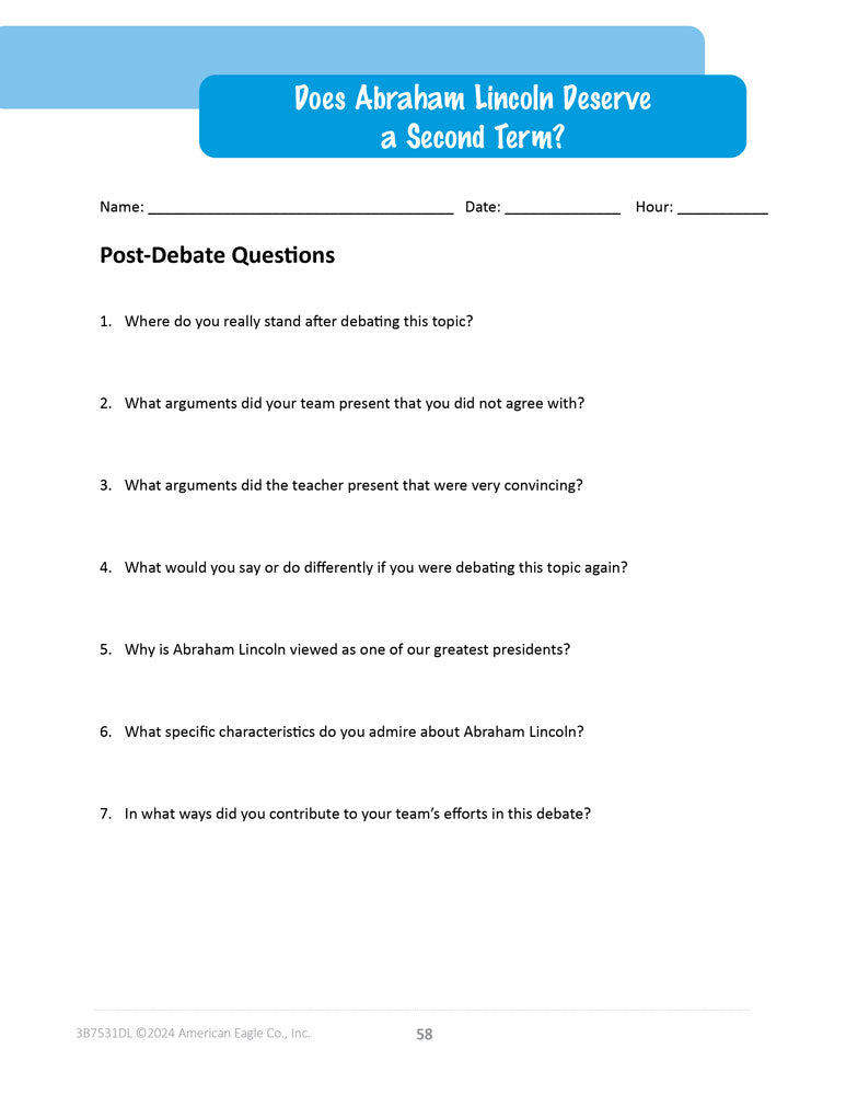 To make debates even easier, you'll also get extension ideas to expand on the provided topics, follow-up questions that ensure students come away from each debate with well-rounded knowledge, and a scoring rubric to make grading a no-brainer.