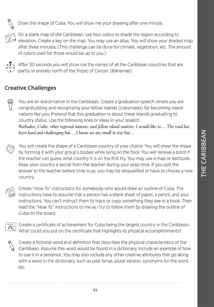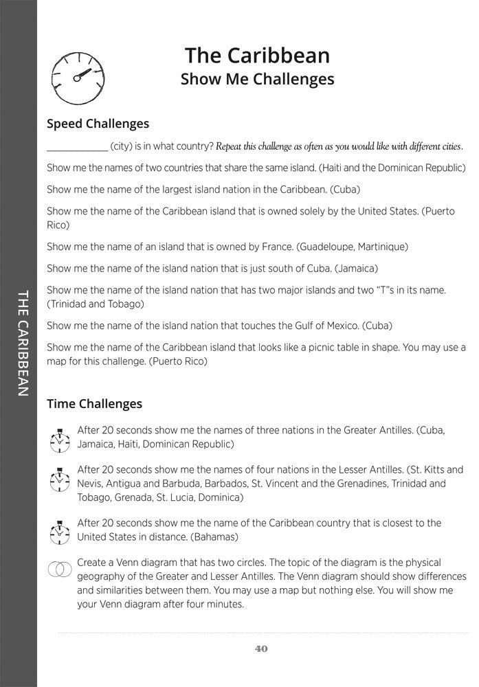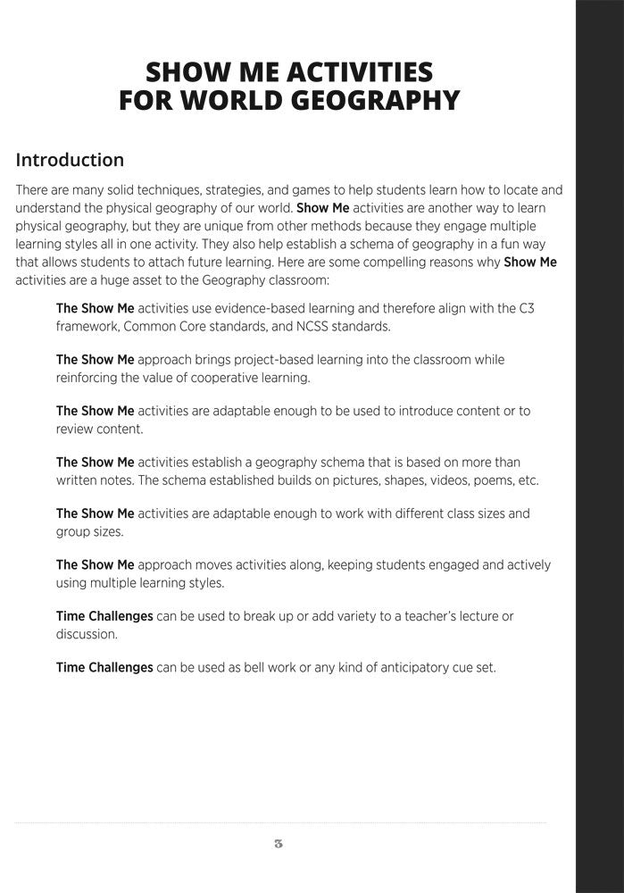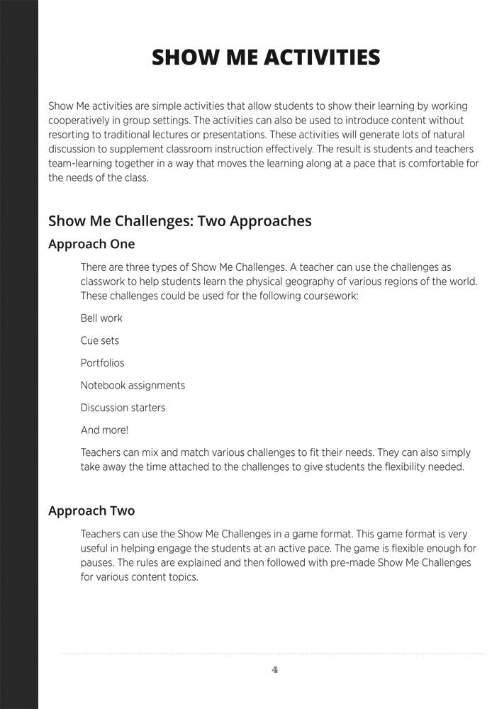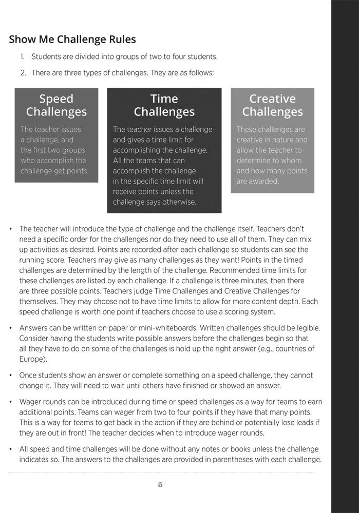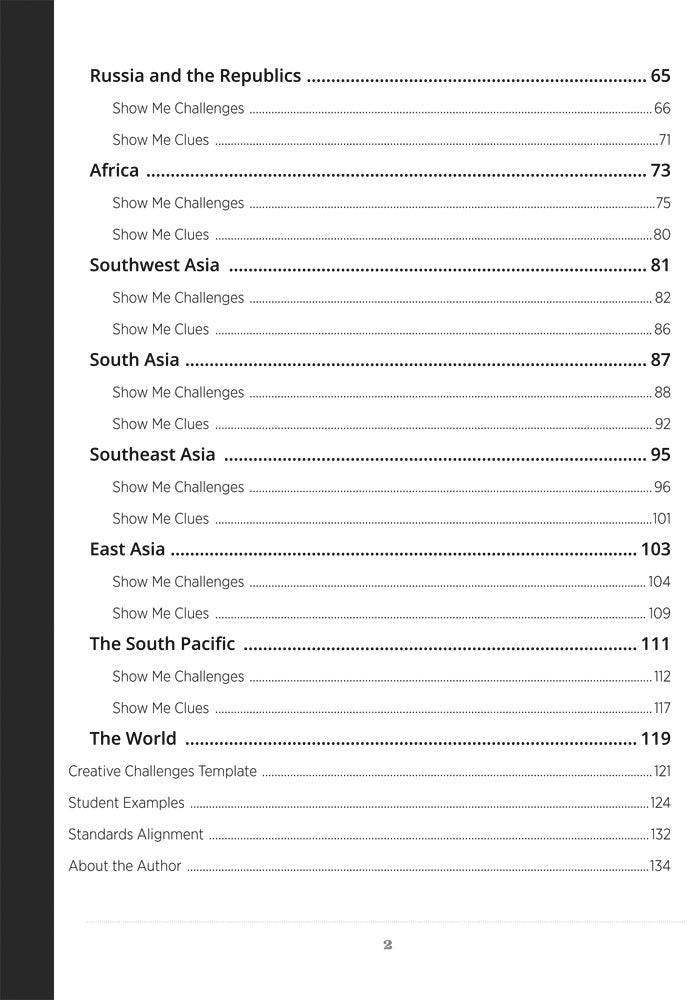 Show Me Challenges and Clues engages students in a new approach to very quick, lively group or partner activities. Hundreds of activities cover all major regions of the world and can be woven into regular coursework or make for an exciting game format!