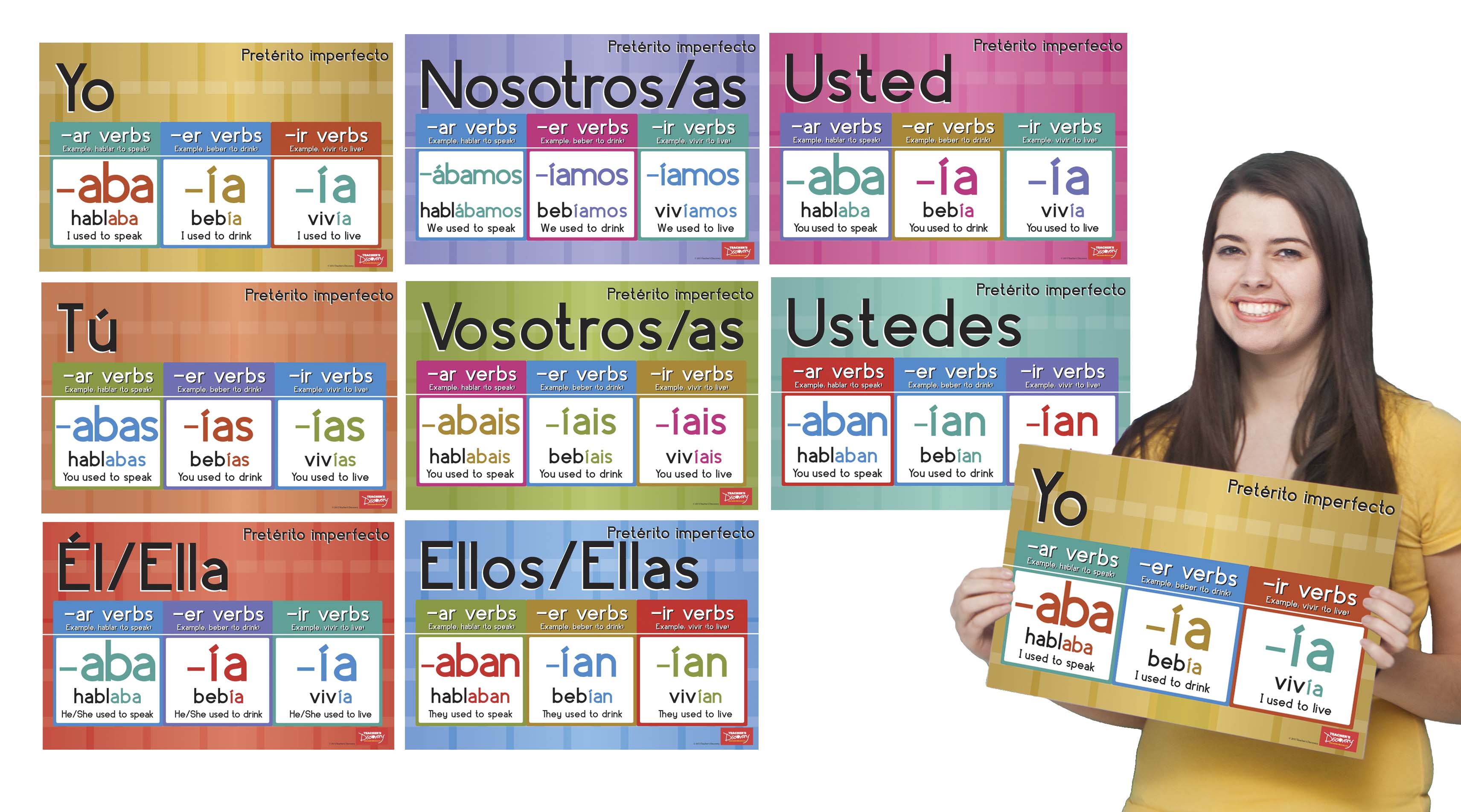 This stylish bulletin board set is excellent for mastering Spanish Pretérito imperfecto –ar, -er and –ir verbs. Remind your students of the proper verb endings. Available as a set of eight. 11 x 17 inches. Cardstock.