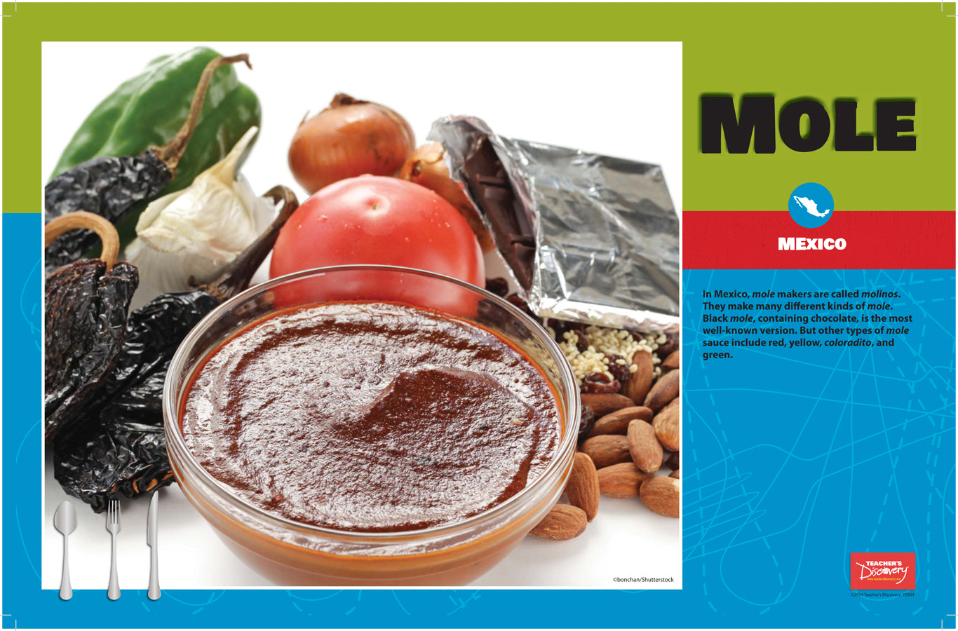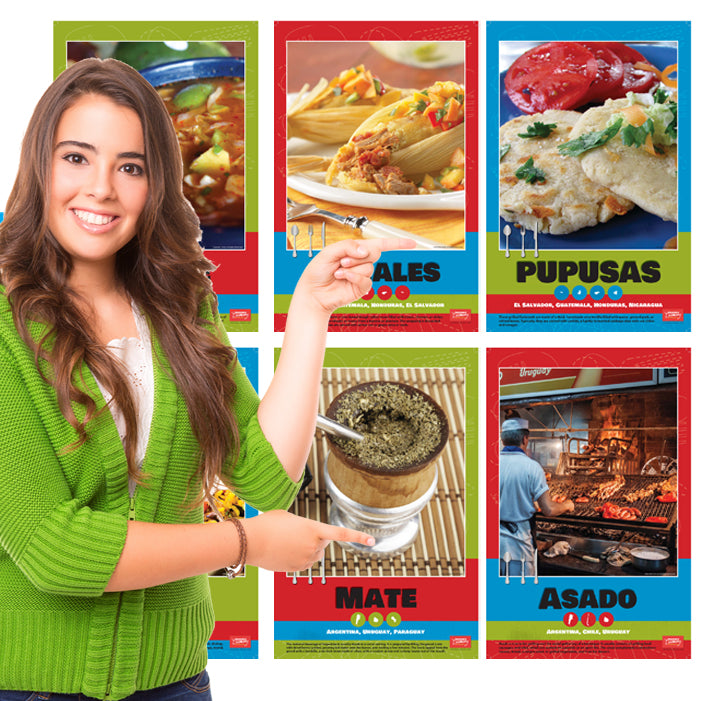 Teach your students about the culture through their stomachs. Your students will be fascinated with the types of food available throughout the Spanish-speaking world. Show them jamón ibérico from Spain, pozole from Mexico, and how many countries have a type of empanada. Each of the 12 cards highlights a specific dish, the regions where it is most commonly found, and an explanation of what it is. 11 x 17 inches. Cardstock. 12 cards.