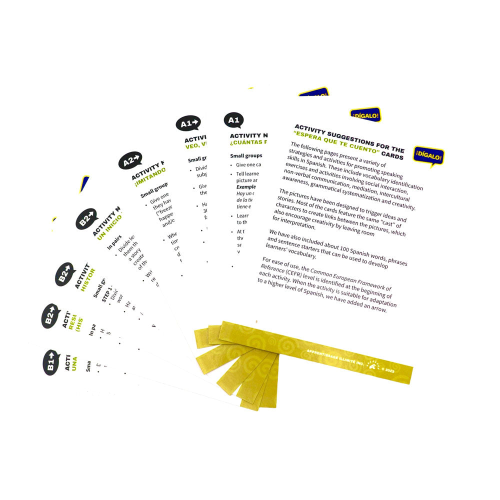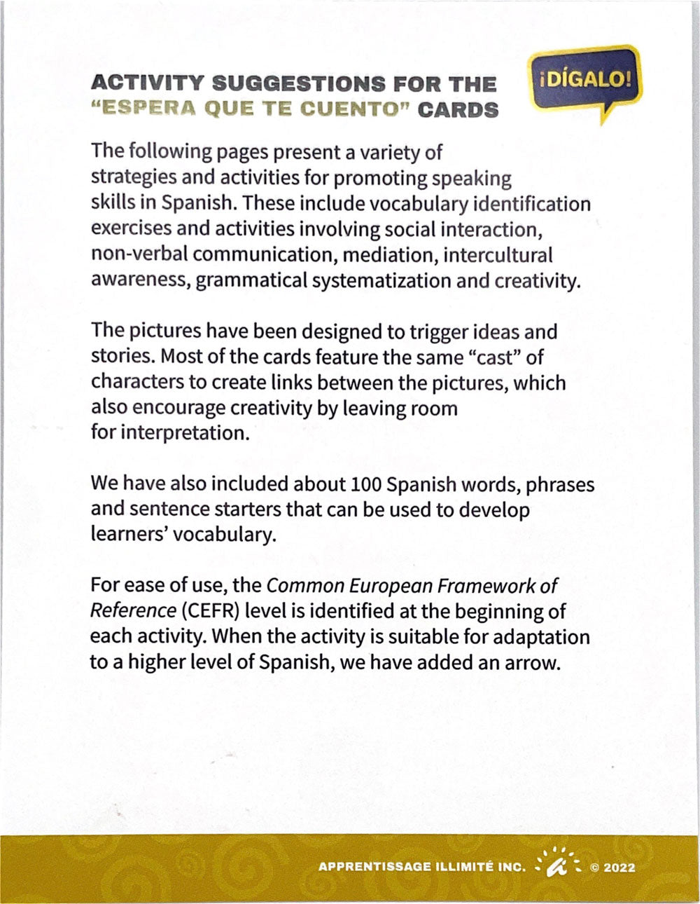 This versatile activity pack encourages players to create stories in Spanish. It features 50+ picture cards illustrating funny situations and more than 100 Spanish expressions to include in the stories told. Combine new illustrations to create new stories, act out the story created, use the expressions in context, or think about what happened before or what will happen next. Over 10 strategies to use with beginner (A1) to advanced (C2) levels.