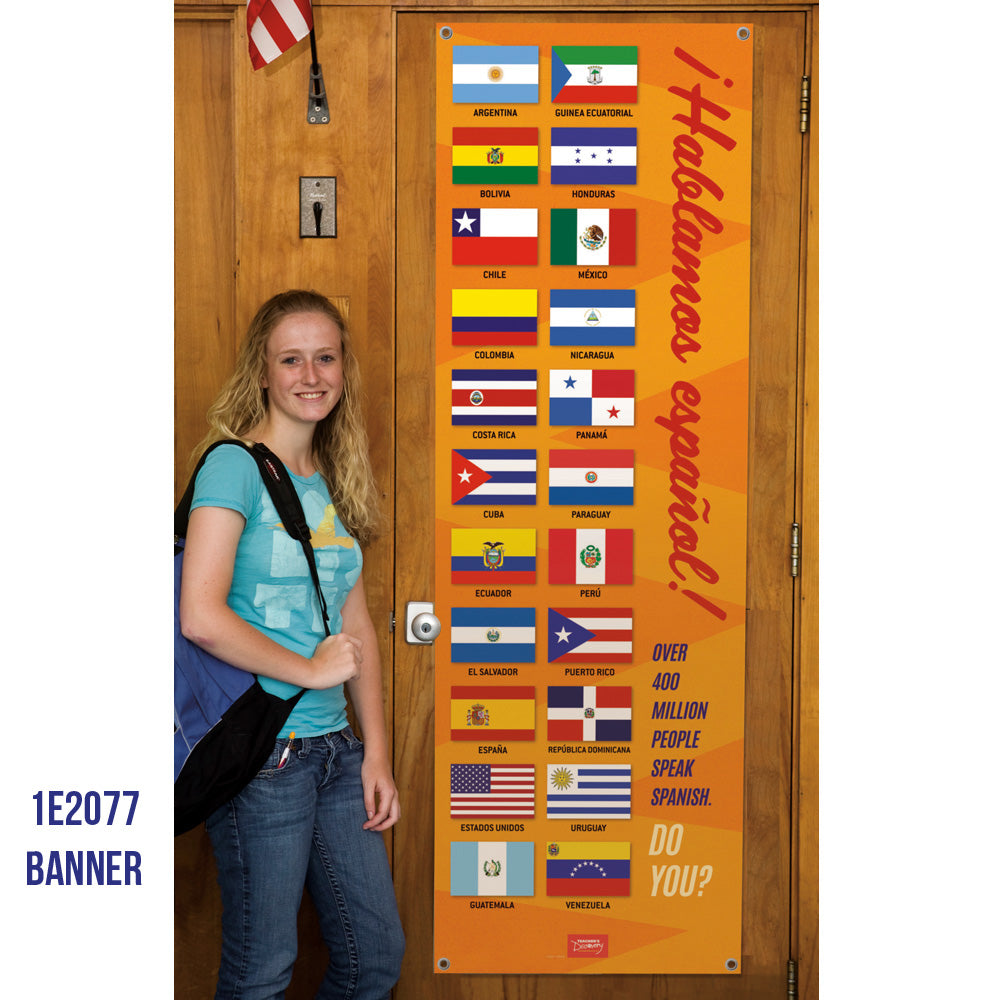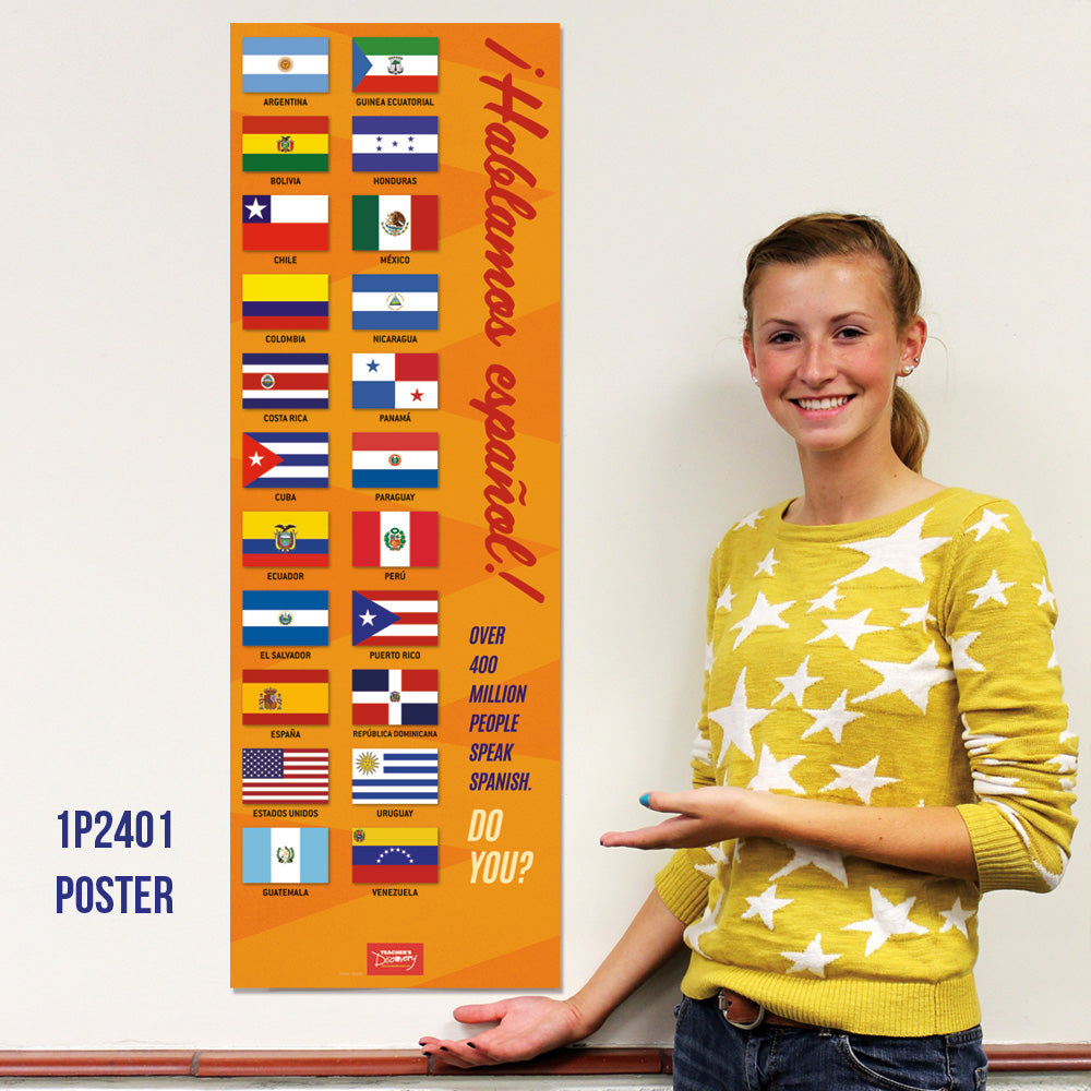 Show all the countries that speak Spanish, in one poster. Available in both laminated and vinyl with grommets so it's easy to hang no matter your classroom. From Puerto Rico to Peru, Equatorial Guinea to El Salvador, spread over five continents.