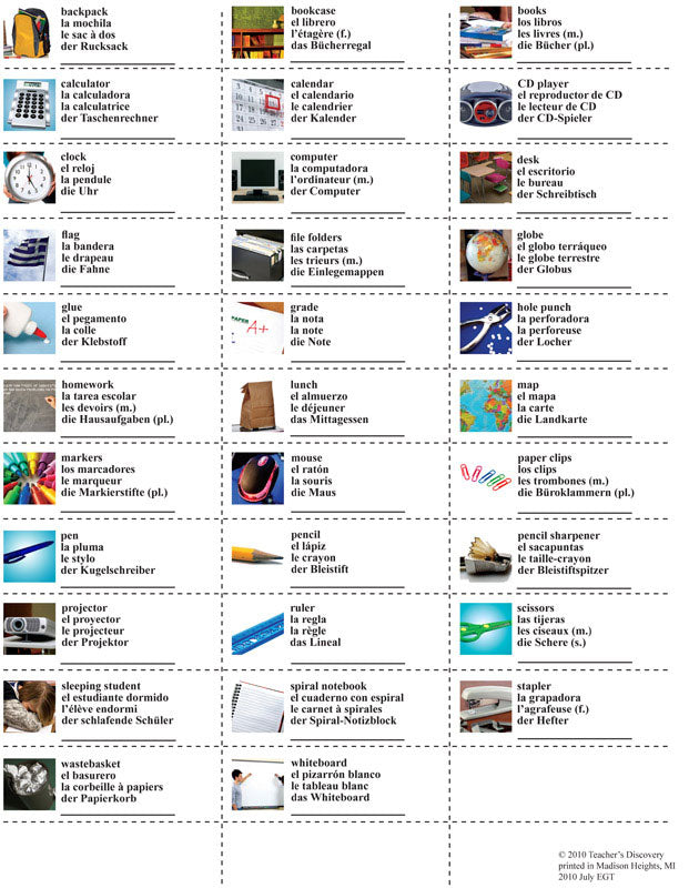 Flash cards with 32 topic-related vocabulary words. The flash cards are 6.5 x 5 inches with vocab in English, Spanish, French and German; plus a blank space to add your own language on the back. We've even included a reproducible study sheet for the students.