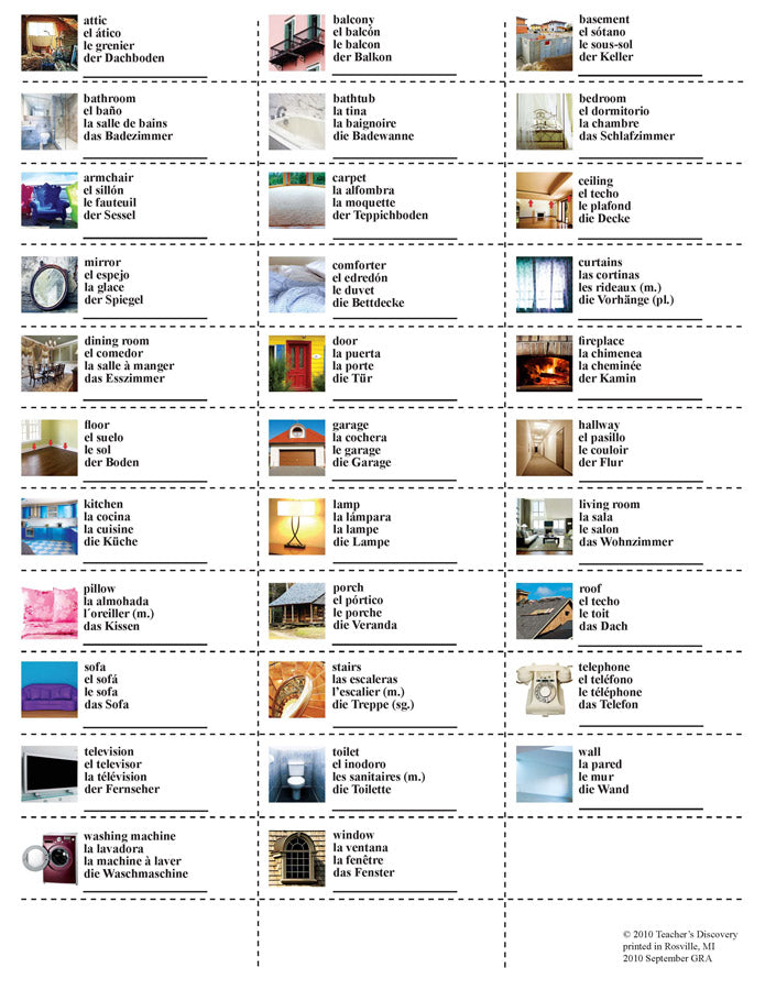 Vocabulary includes: attic, balcony, basement, bathroom, bathtub, bed, chair, carpet, ceiling, comforter, curtains, dining room, door, fireplace, floor, garage, hallway, kitchen, lamp, living room, mirror, pillow, porch, roof, sofa, stairs, telephone, television, toilet, wall, washing machine and window.