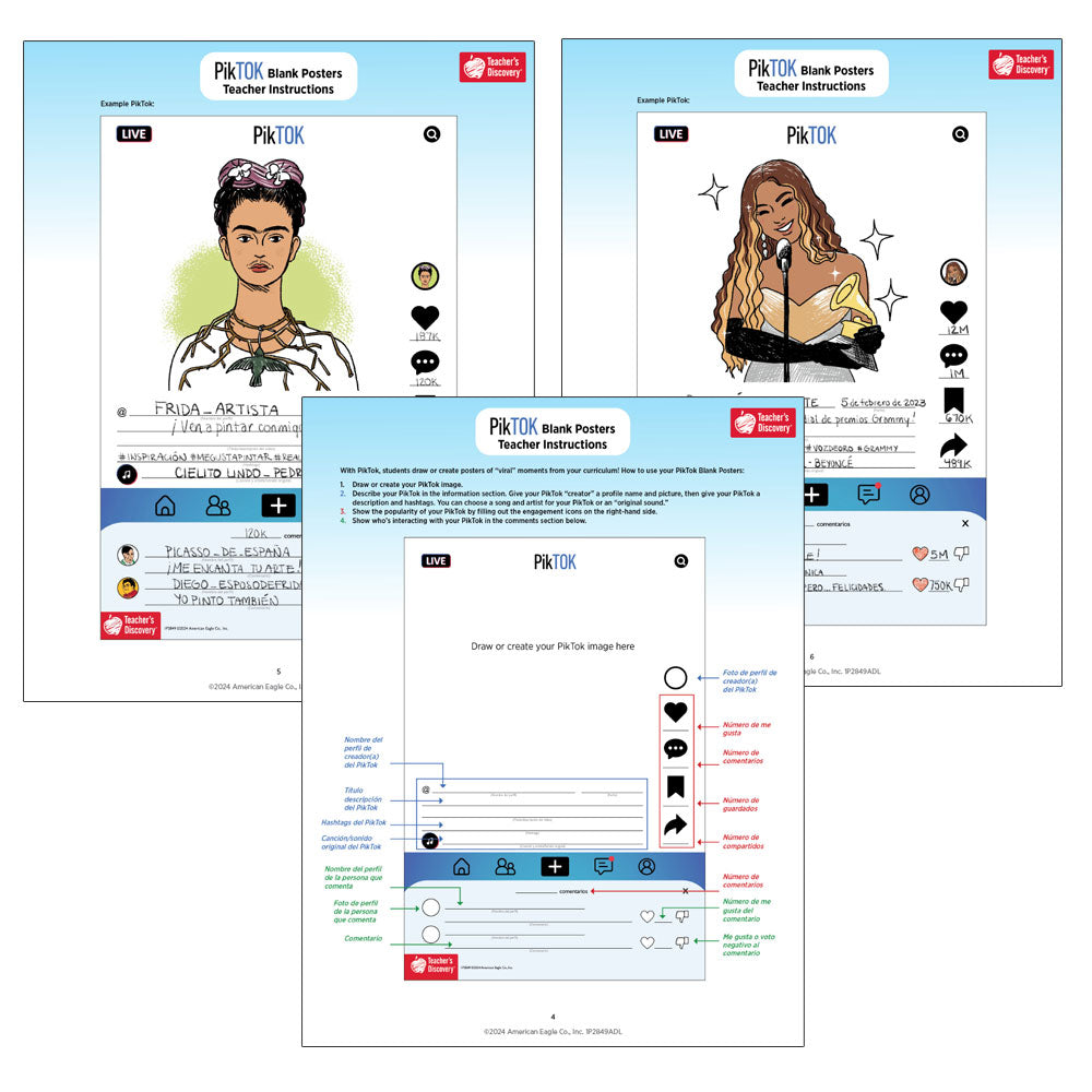 It’s not TikTok—it’s PikTok! PikTok posters use a familiar format to get students invested in the topics you teach. Students draw and write to create posters of “viral” moments in Spanish, practicing vocabulary and grammar to record events from their daily lives, celebrity antics, and more. Includes 35 blank posters and an instructions download.