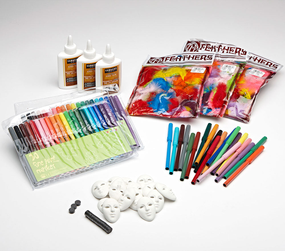 Mardi Gras Ceramic Mask Decorating Kit contains 30 ceramic masks, 60 markers to share, 30 strong magnets, 3 bags of feathers, and 3 bottles of glue.