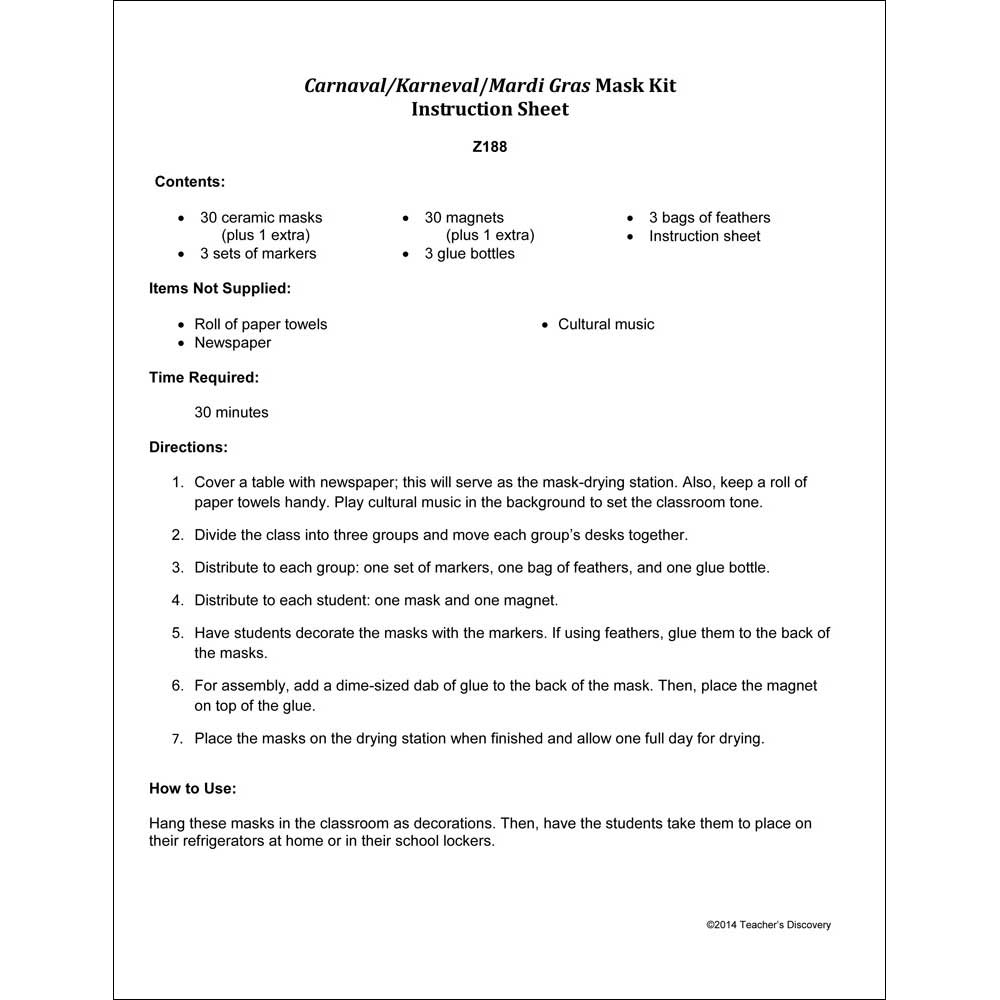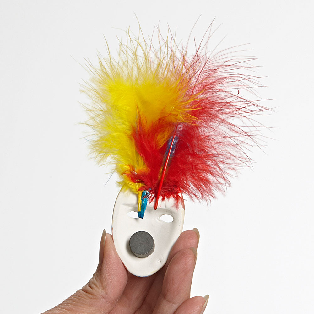 A simple and easy craft kit for students to complete in one classroom period. Just give your students a ceramic mask and markers for decorating. Then, have them add a drop of glue to the back for decorative feathers and to place the magnet. Let the glue dry overnight, and you have a cultural lesson that is fun for the students and easy on you.