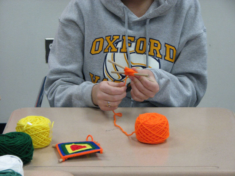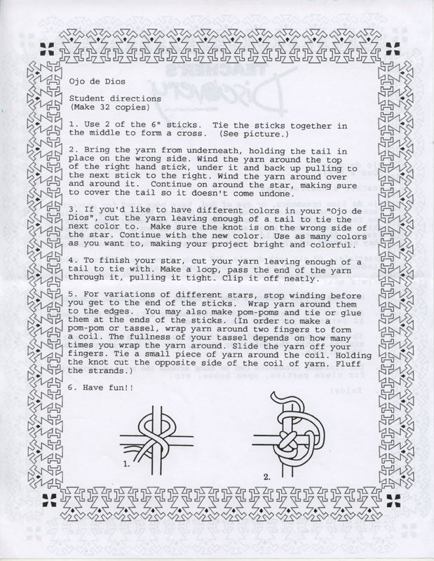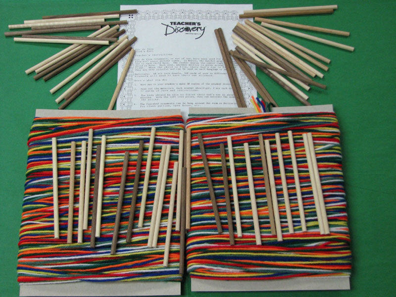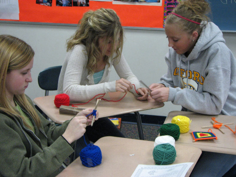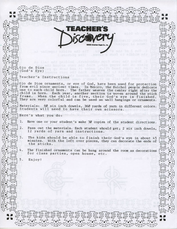 God's Eyes are popular and easy to make! Mexicans traditionally give them to their children on their birthdays. They often represent the sun, rain and food. This kit includes yarn, dowels and instructions to make 30 wall hangings six inches. All levels.