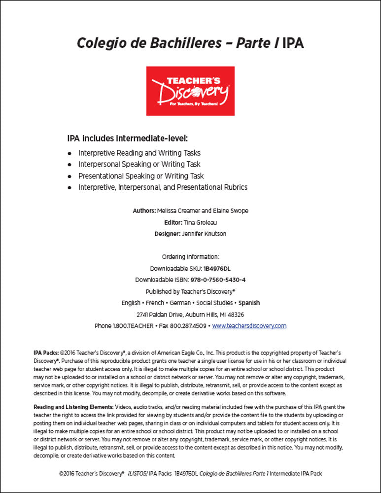 This pack includes step-by-step instructions, and reading and listening comprehension activities that follow the ACTFL model. Complete with an explanation of an IPA and how to use it, and nine Interpretive Tasks that break down the content, increase recognition of key words and phrases, develop context awareness, and promote language usage. In addition, it provides creative options for writing and/or speaking Interpersonal and Presentational Tasks, answer keys, and intermediate-level rubrics for each mode.