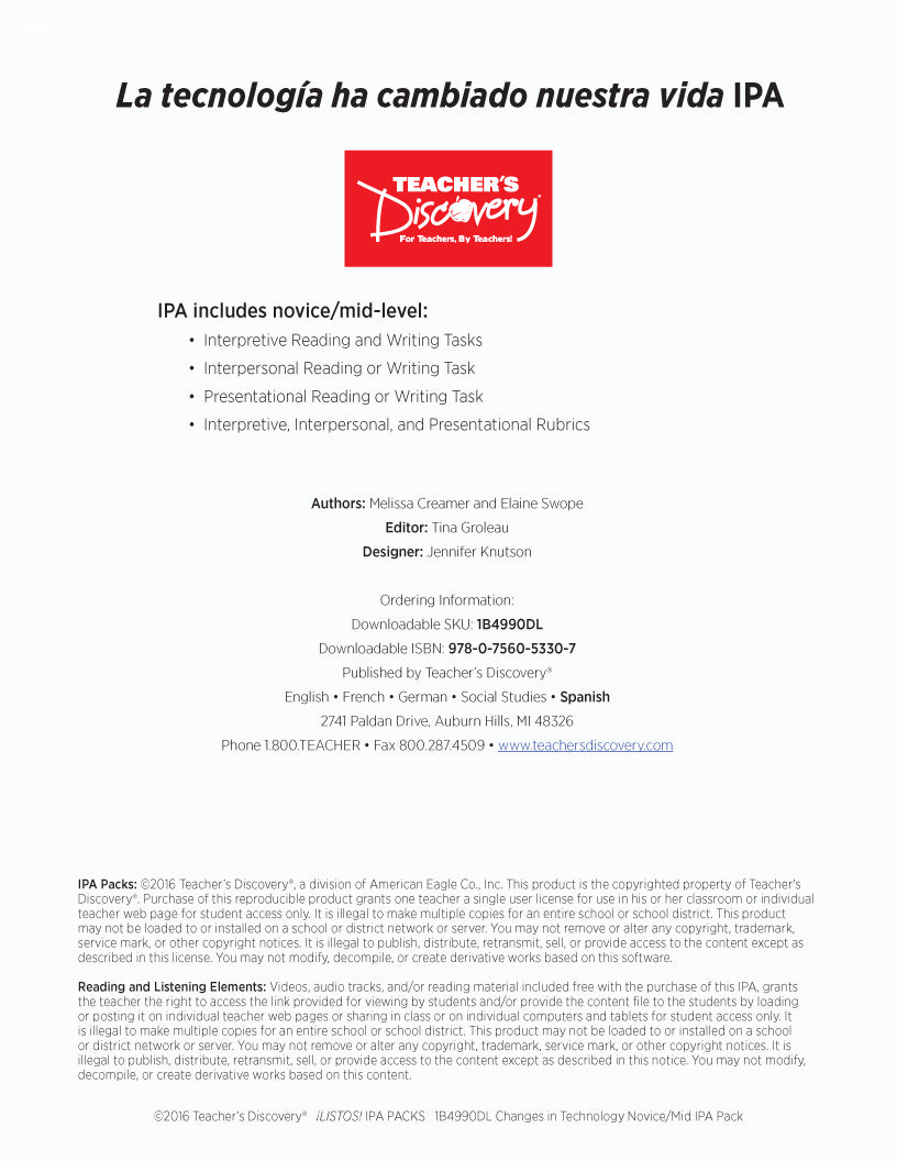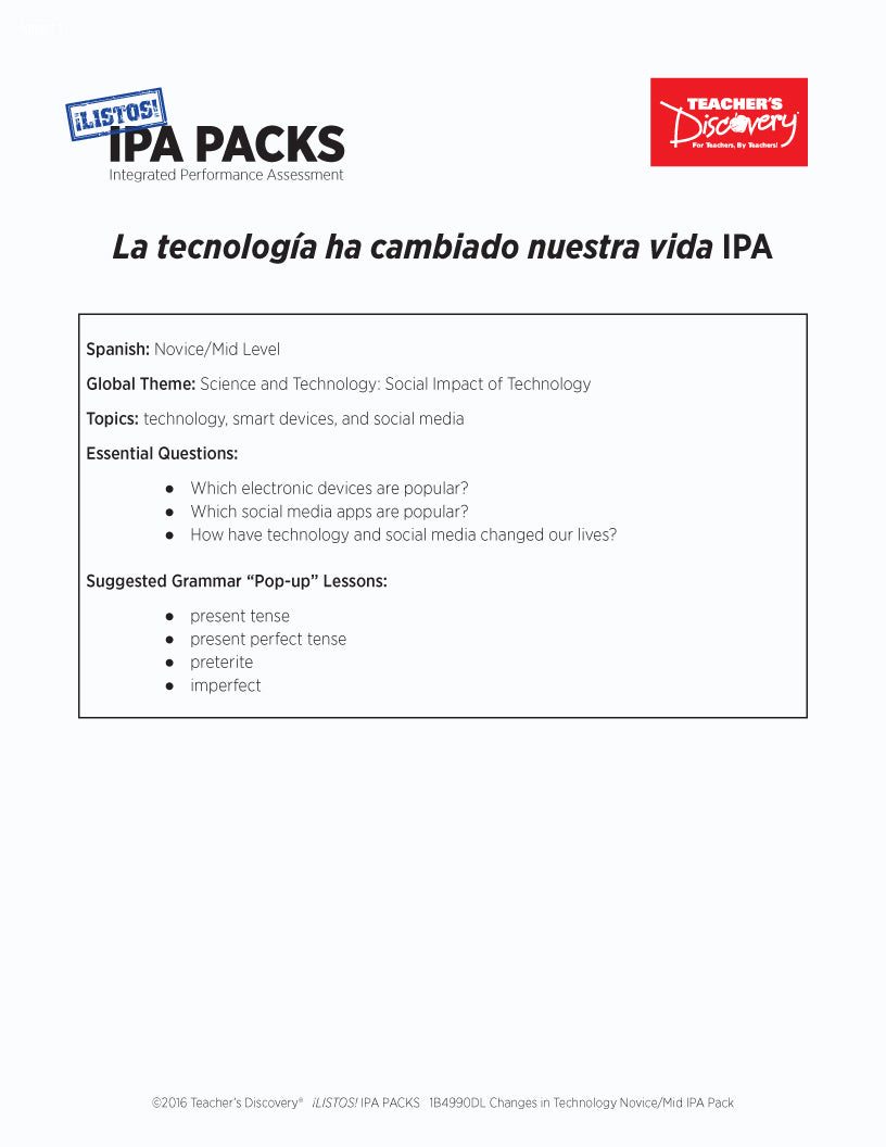 Changes in Technology Novice-Mid Spanish IPA Pack - DIGITAL RESOURCE DOWNLOAD is backordered and will ship as soon as it is back in stock.