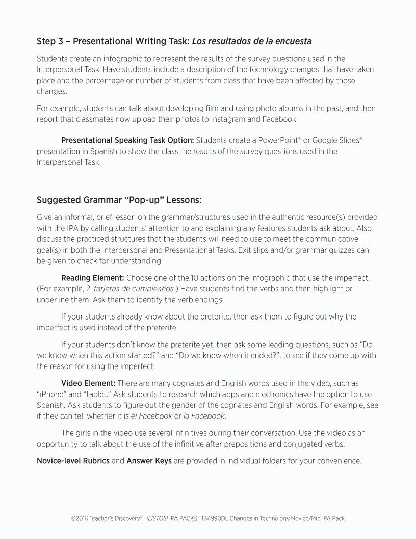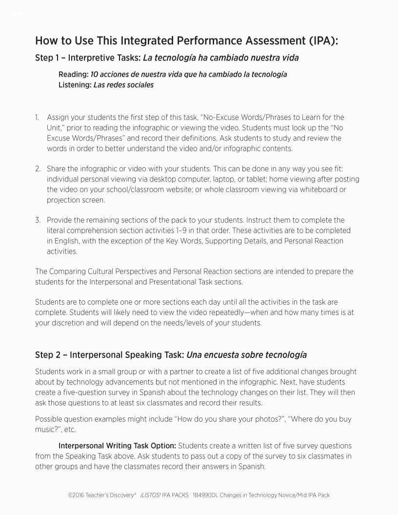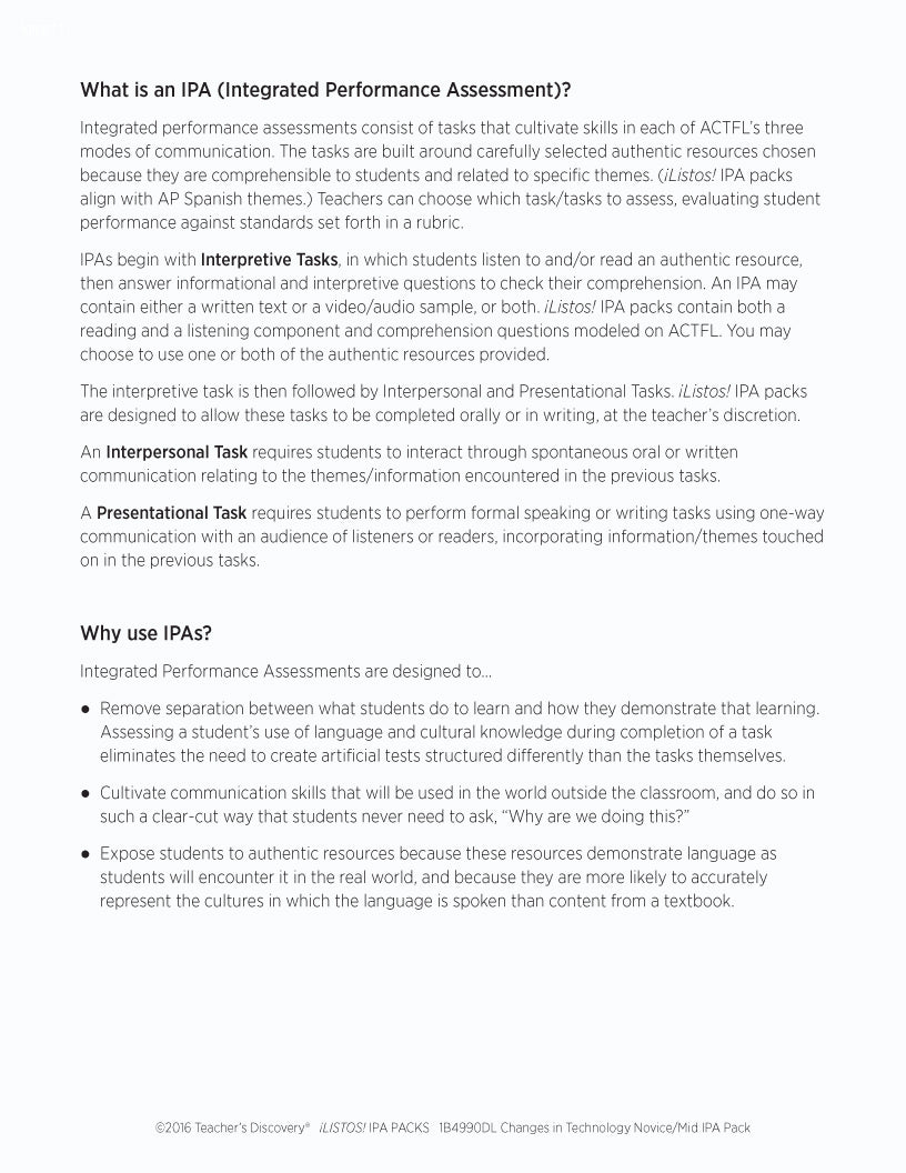This pack includes step-by-step instructions, and reading and listening comprehension activities that follow the ACTFL model. Complete with an explanation of an IPA and how to use it, and nine Interpretive Tasks that break down the content, increase recognition of key words and phrases, develop context awareness, and promote language usage. In addition, it provides creative options for writing and/or speaking Interpersonal and Presentational Tasks, answer keys, and rubrics for each mode.