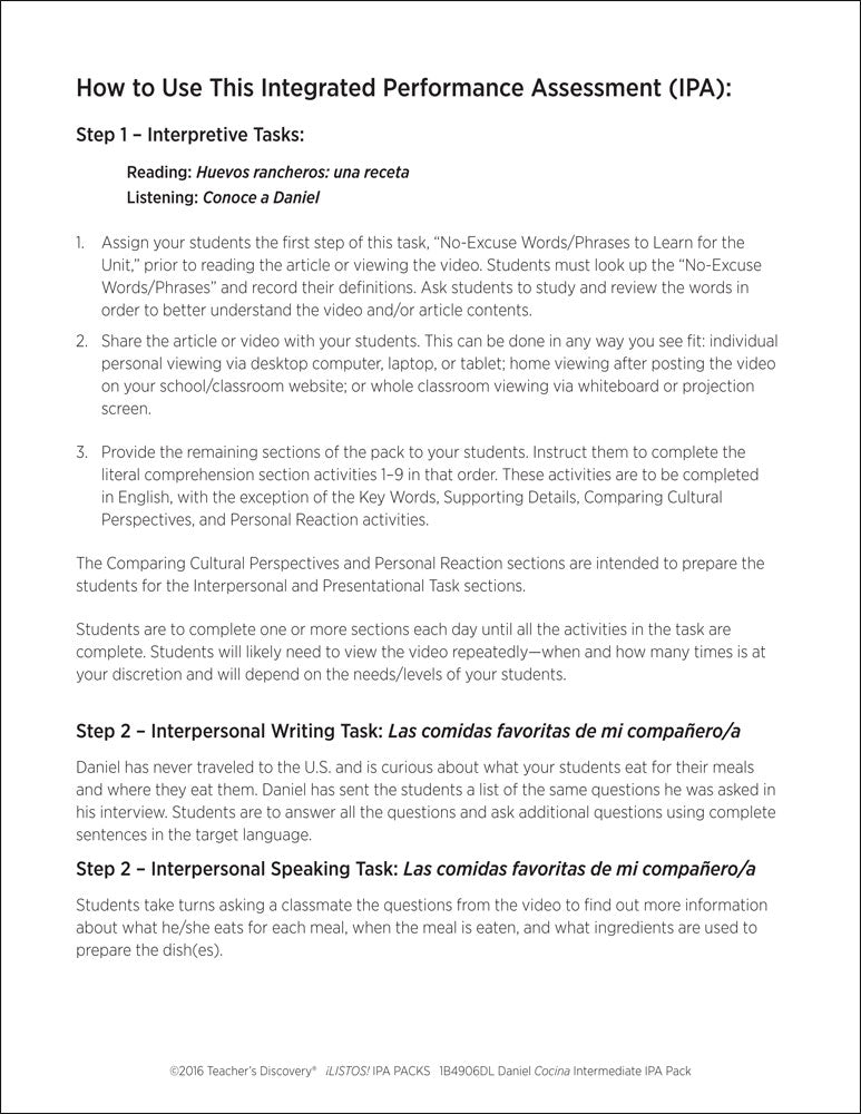 This pack includes step-by-step instructions, and reading and listening comprehension activities that follow the ACTFL model. Complete with an explanation of an IPA and how to use it, and nine Interpretive Tasks that break down the content, increase recognition of key words and phrases, develop context awareness, and promote language usage. In addition, it provides creative options for writing and/or speaking Interpersonal and Presentational Tasks, answer keys, and intermediate-level rubrics for each mode.