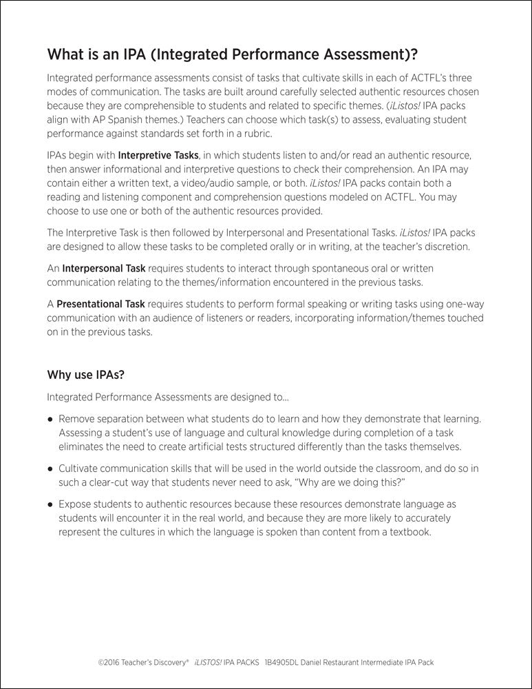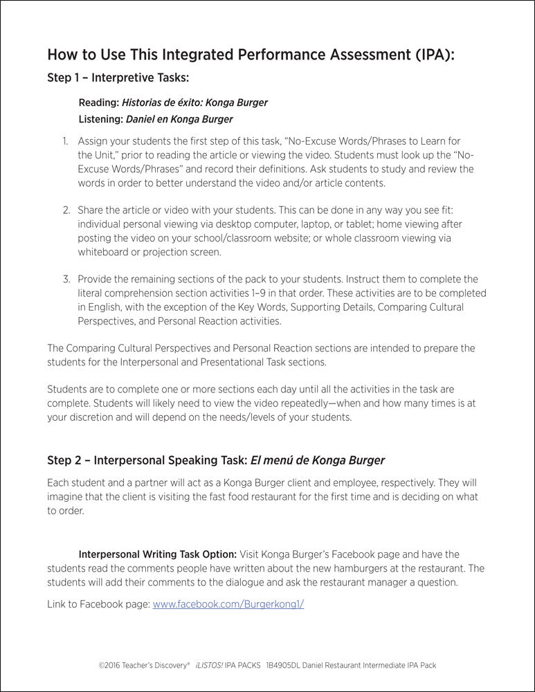 This pack includes step-by-step instructions, and reading and listening comprehension activities that follow the ACTFL model. Complete with an explanation of an IPA and how to use it, and nine Interpretive Tasks that break down the content, increase recognition of key words and phrases, develop context awareness, and promote language usage. In addition, it provides creative options for writing and/or speaking Interpersonal and Presentational Tasks, answer keys, and intermediate-level rubrics for each mode.