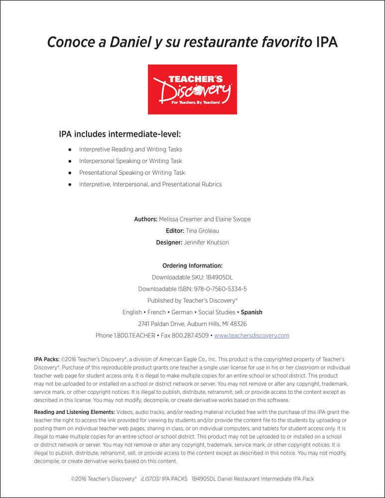 Daniel Restaurant Intermediate-Low Spanish IPA Pack - DIGITAL RESOURCE DOWNLOAD is backordered and will ship as soon as it is back in stock.