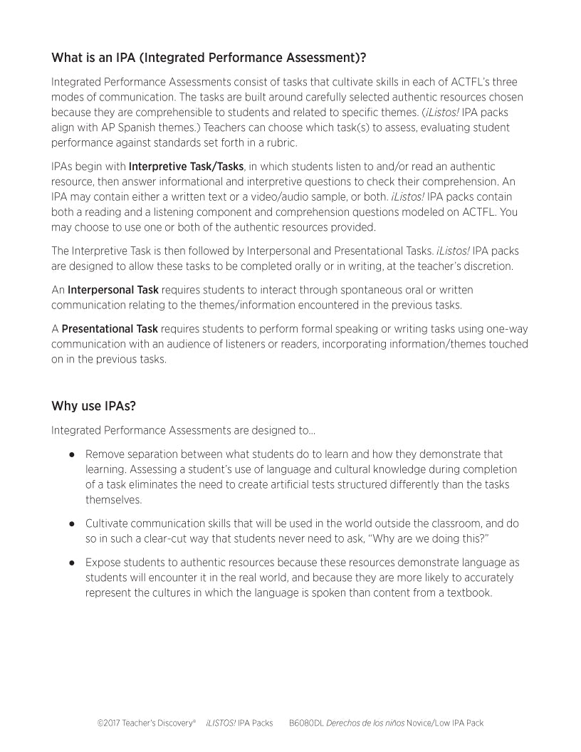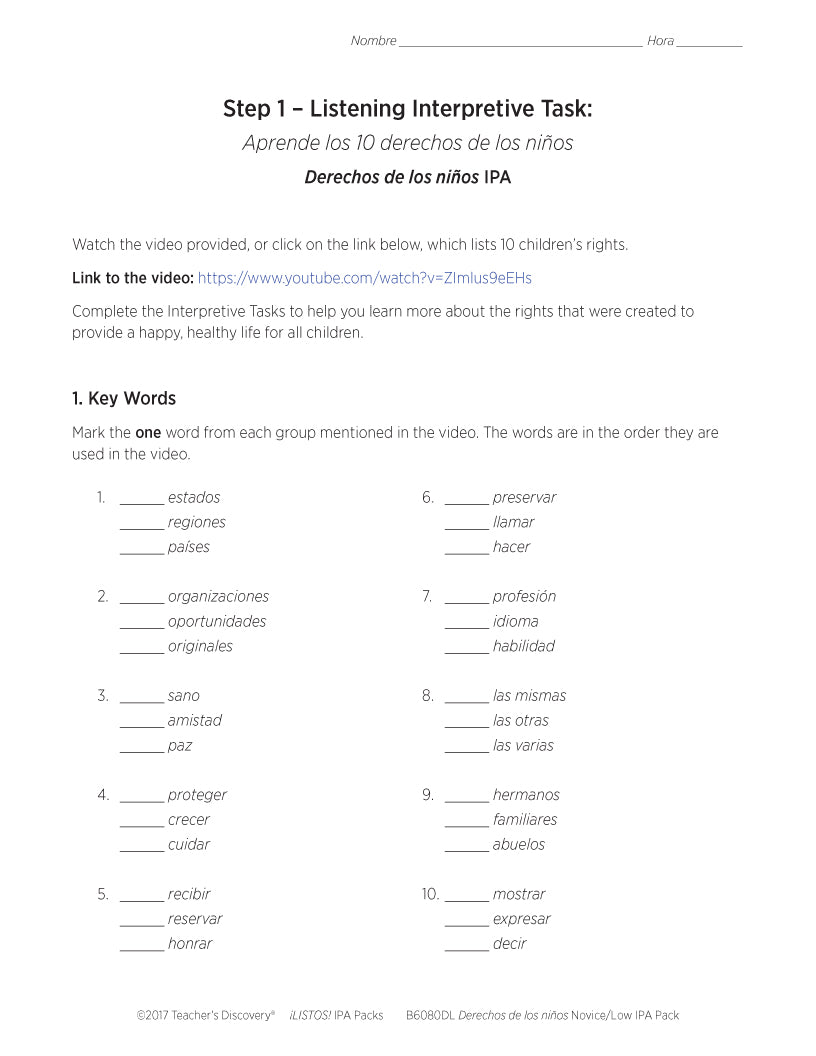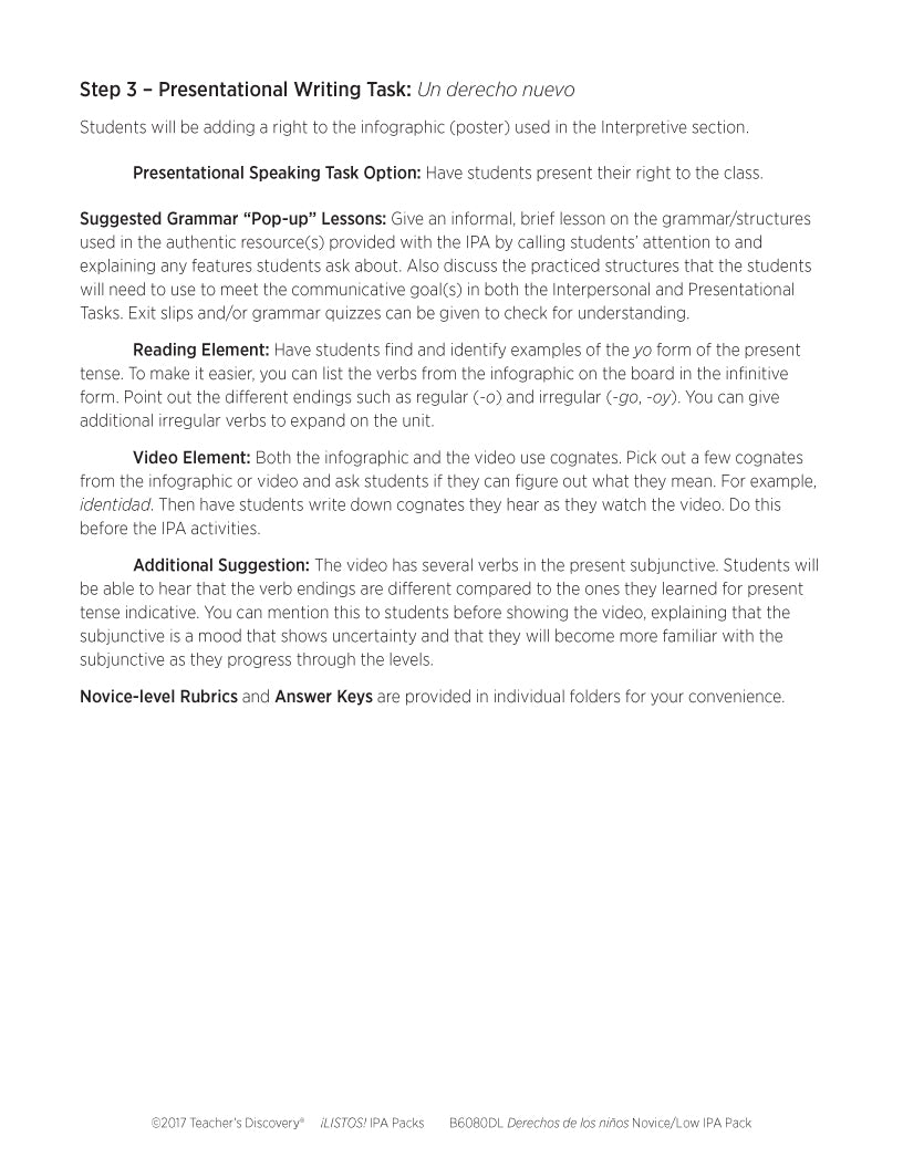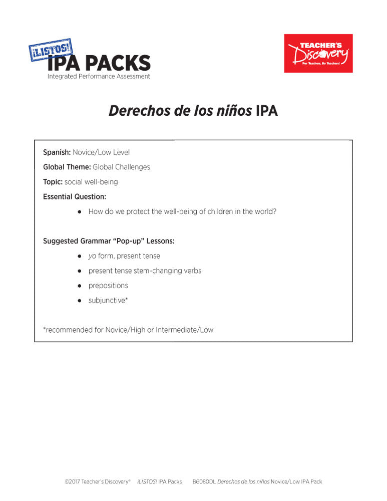 This ¡LISTOS! IPA Pack Download is based on two authentic resources: an infographic and a three-minute video describing 10 children's rights entirely in Spanish.