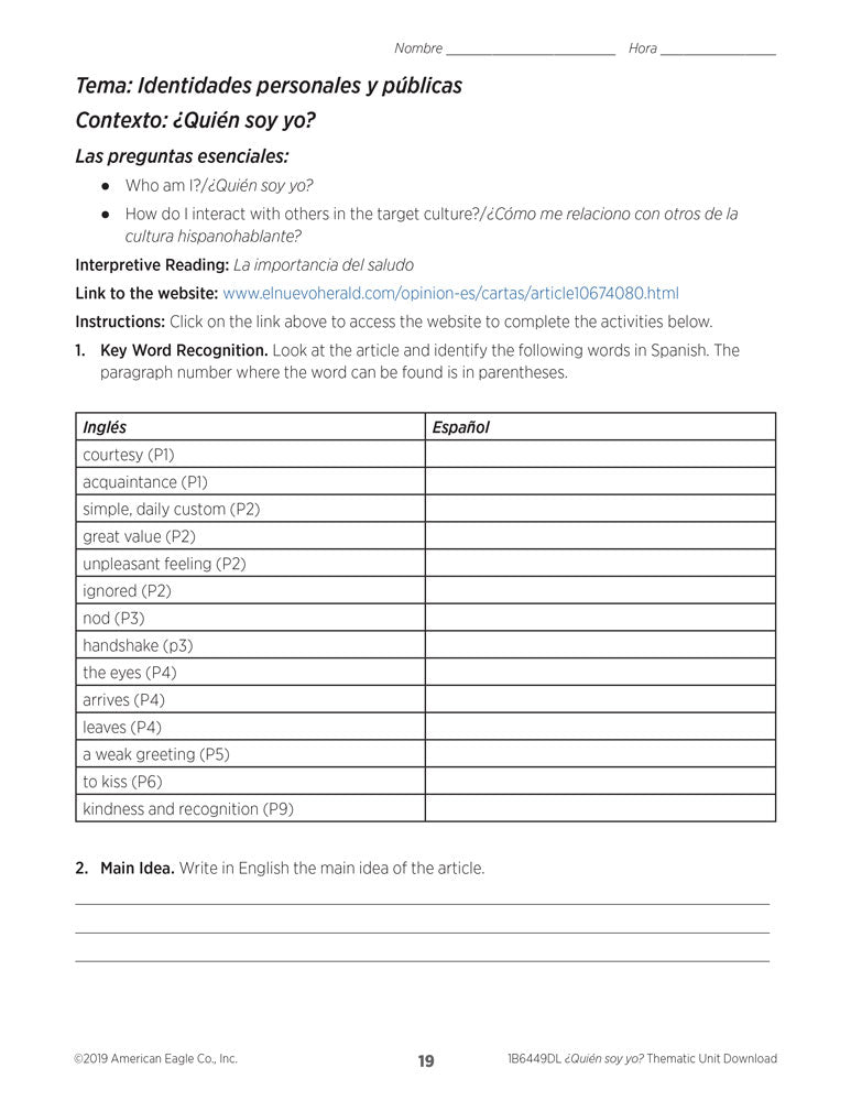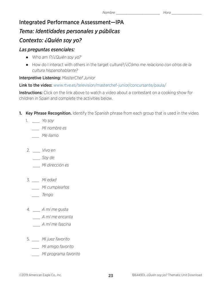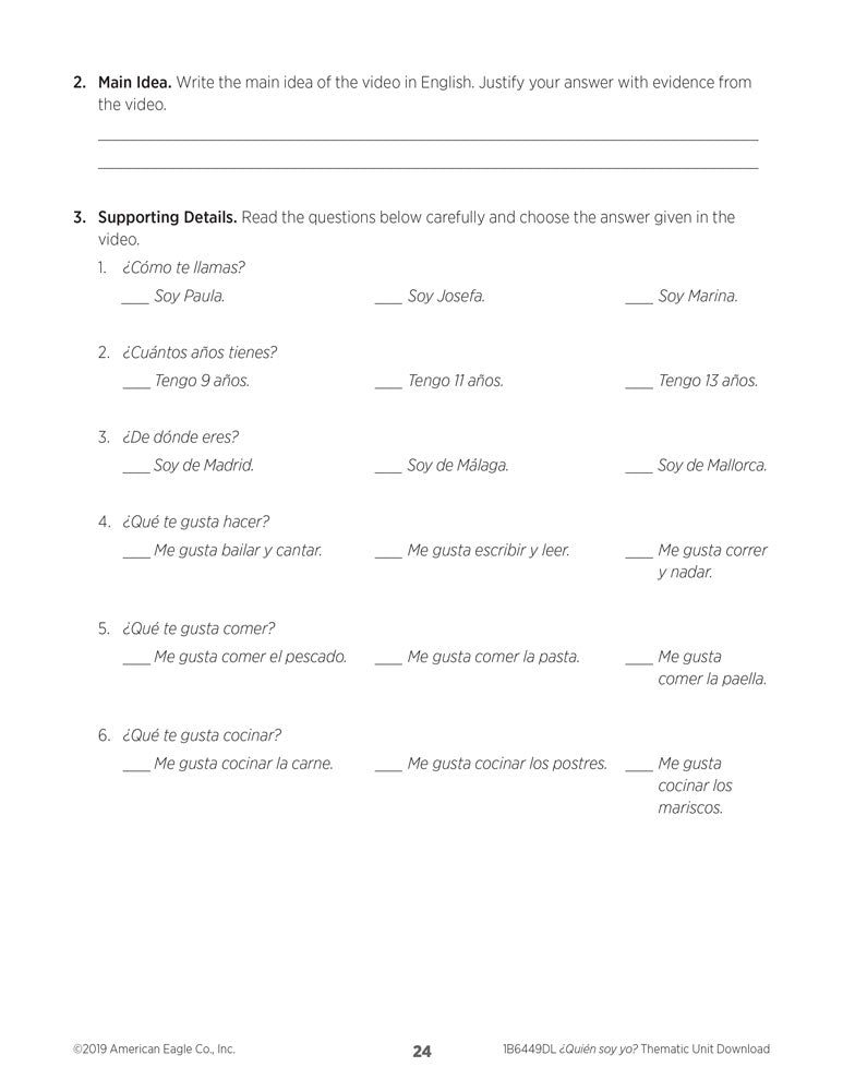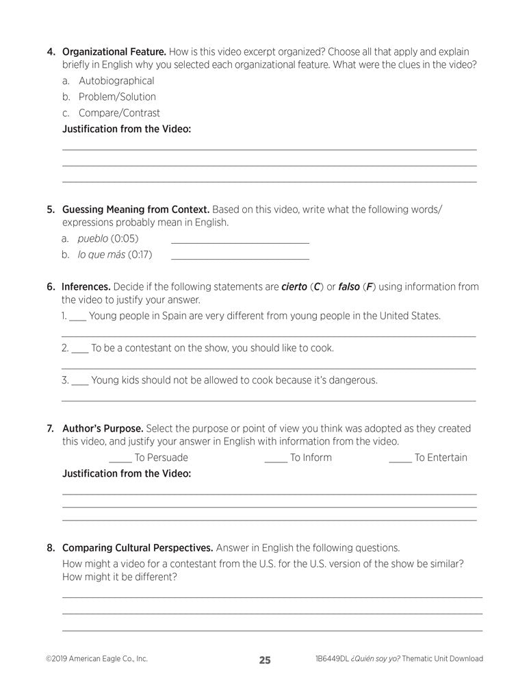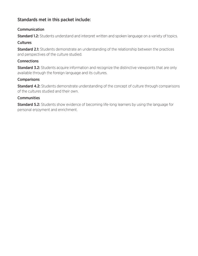 Complete ready-to-use thematic unit built around authentic resources and modeled on ACTFL standards. Break down the content, increase comprehension, and develop cultural awareness by analyzing the products, practices, and perspectives of contemporary Spanish speaking world culture. Teach communication and promote language usage with this novice-level unit.