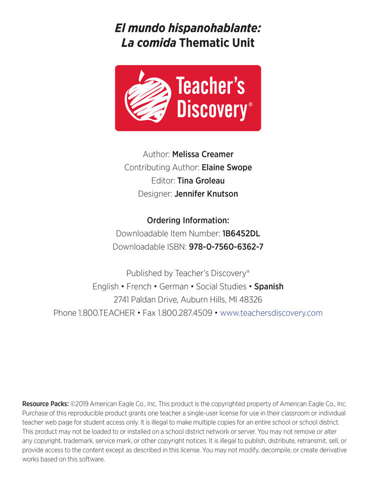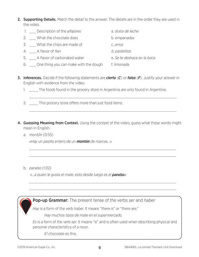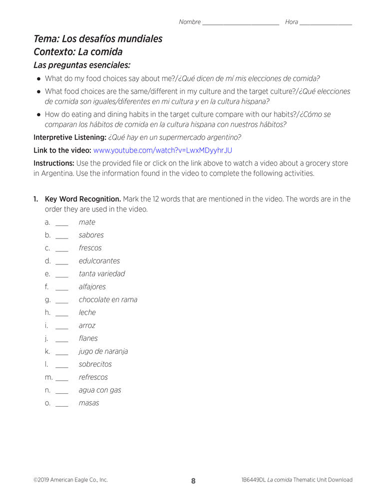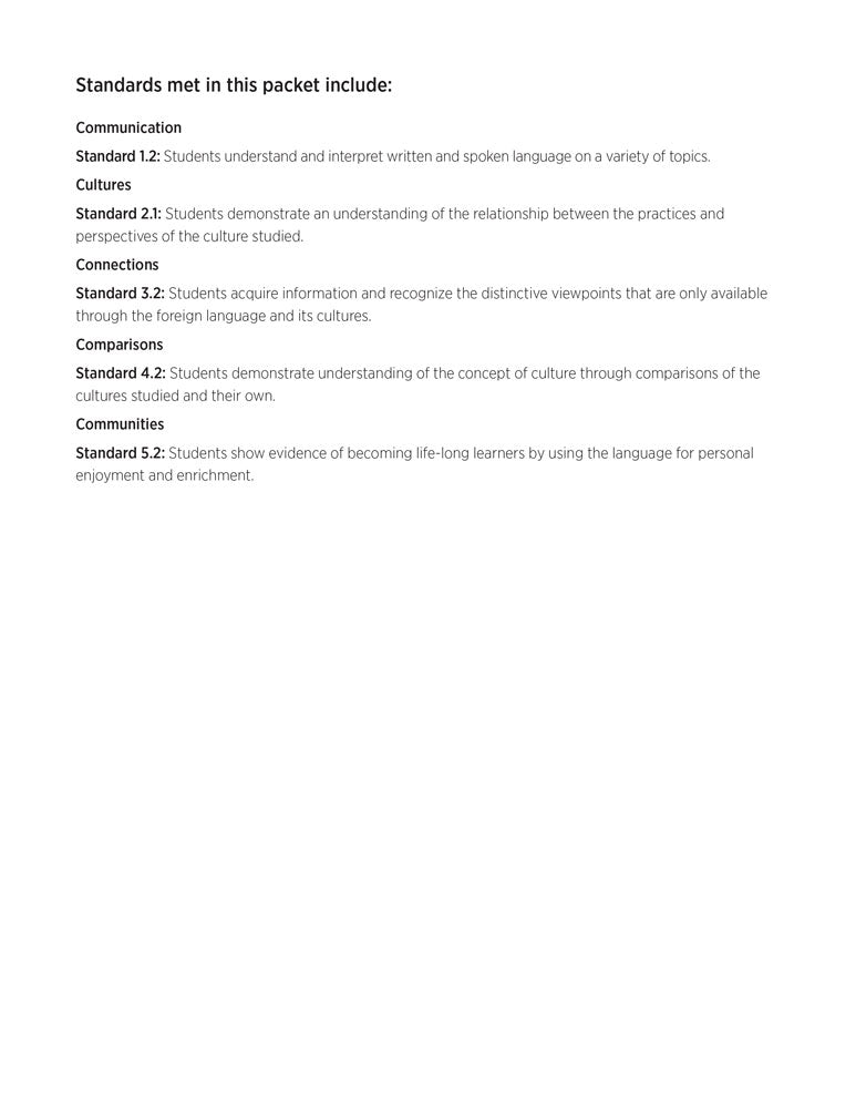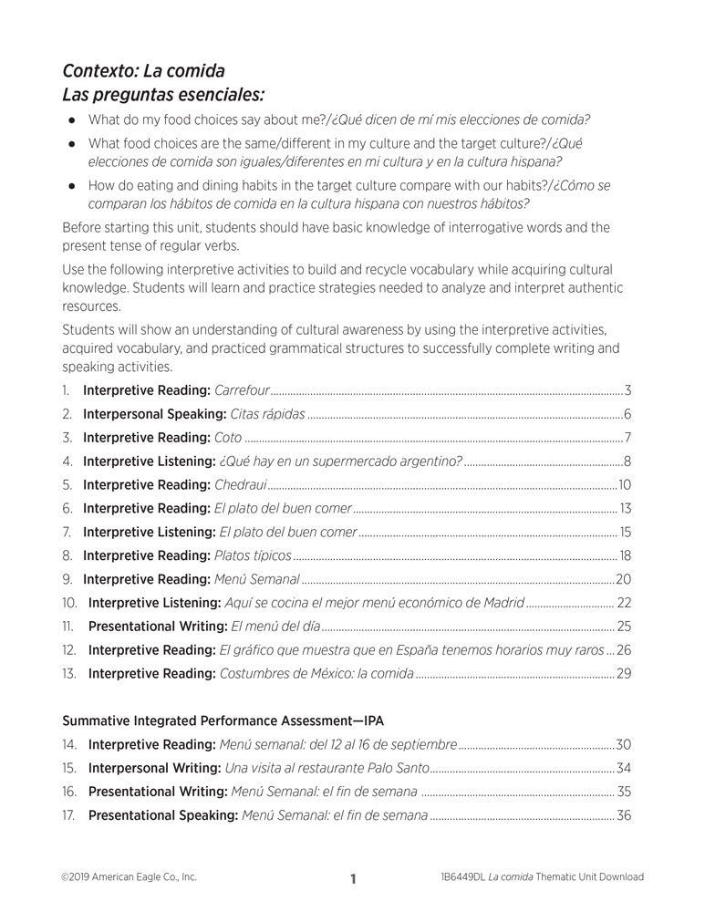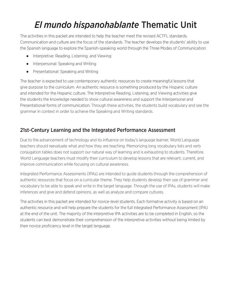 Break down the content, increase comprehension, and develop cultural awareness by analyzing the products, practices, and perspectives of contemporary Spanish-speaking world culture. Teach communication and promote language usage with this novice-level unit. Complete ready-to-use thematic unit built around authentic resources and modeled on ACTFL standards.