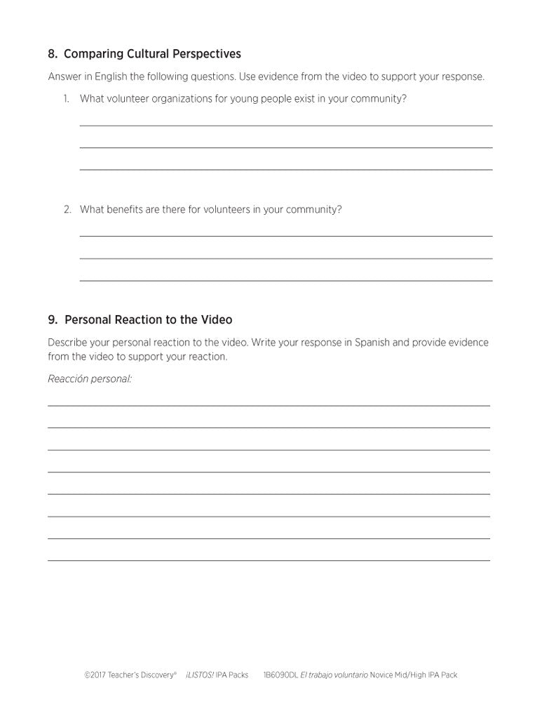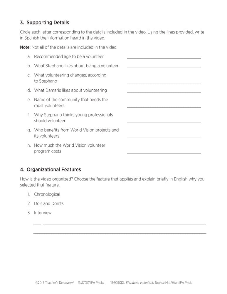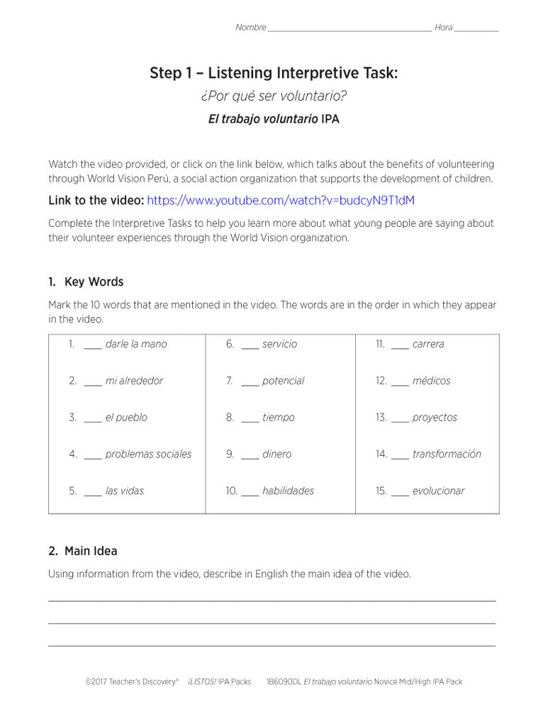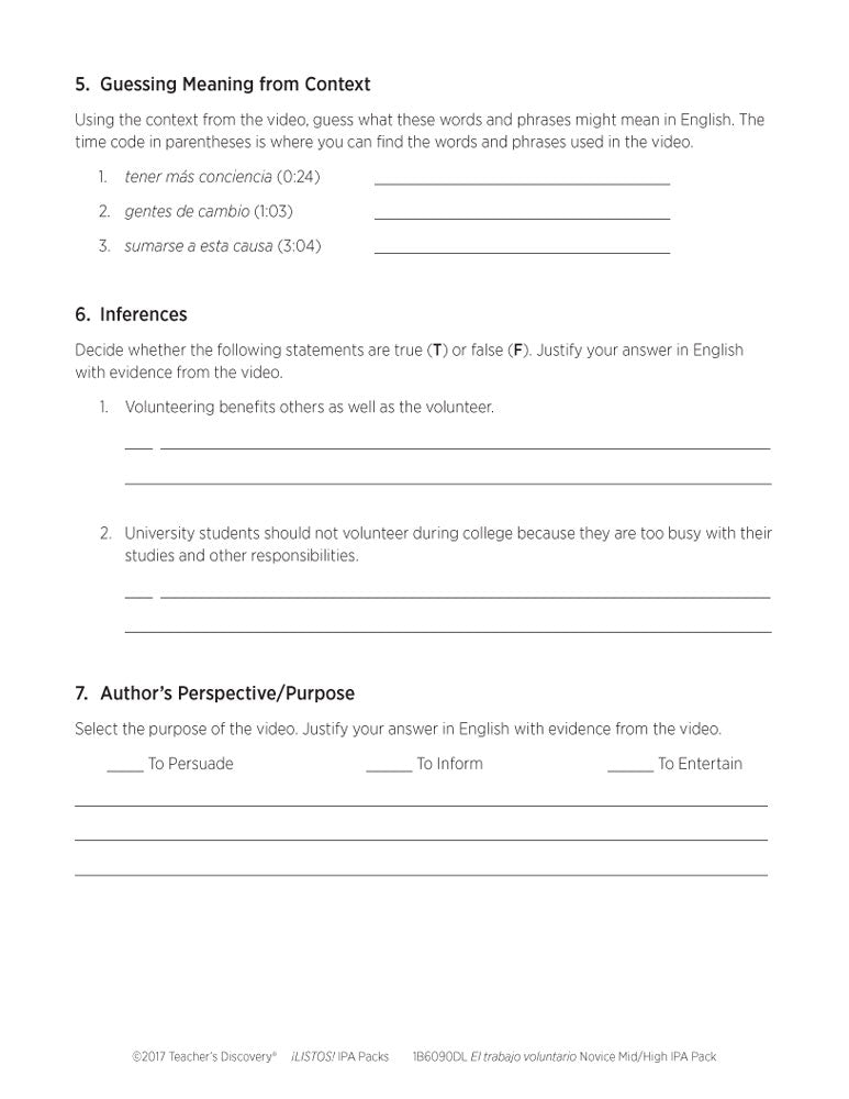 This ¡LISTOS! IPA Pack Download is based on two authentic resources: an infographic and a three-minute video which talks about the benefits of volunteering through World Vision Perú, a social action organization that supports the development of children entirely in Spanish.