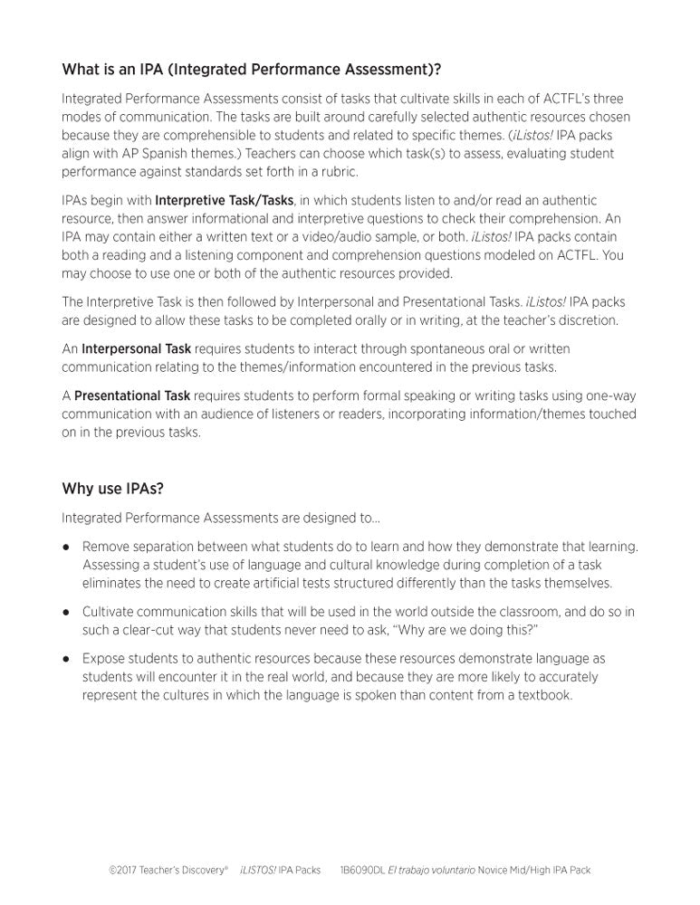 This pack includes step-by-step instructions, and reading and listening comprehension activities that follow the ACTFL model. Complete with an explanation of an IPA and how to use it, and nine Interpretive Tasks that break down the content, increase recognition of key words and phrases, develop context awareness, and promote language usage. In addition, it provides creative options for writing and/or speaking Interpersonal and Presentational Tasks, answer keys, and rubrics for each mode.