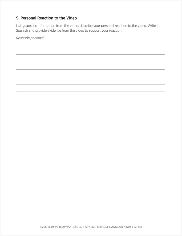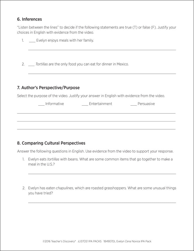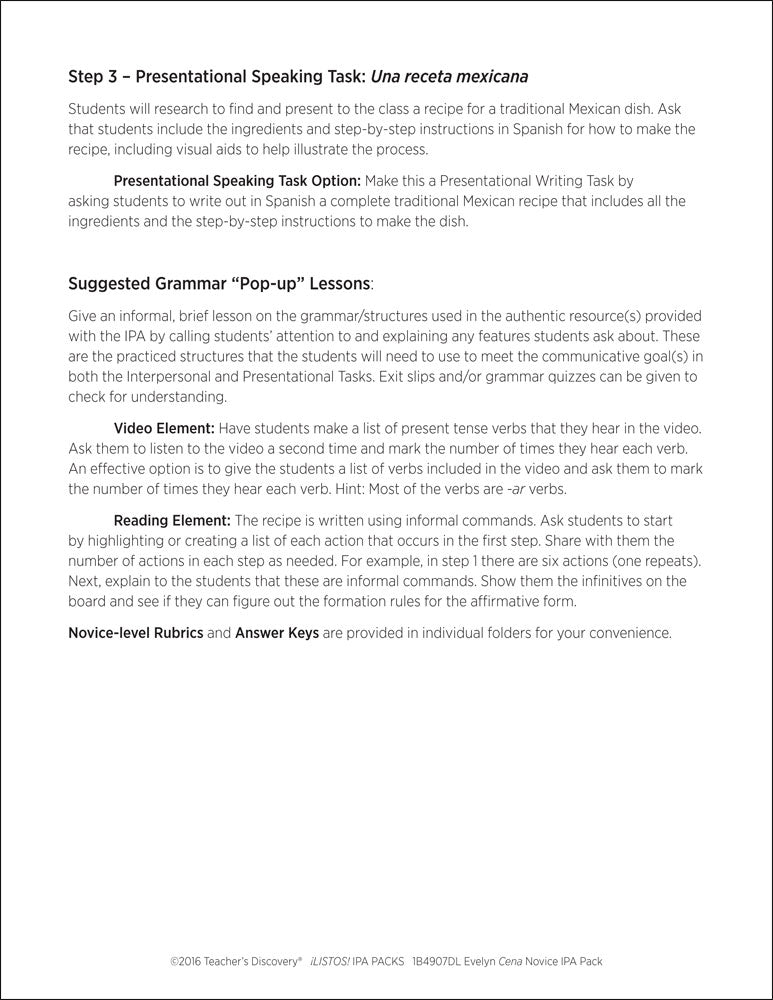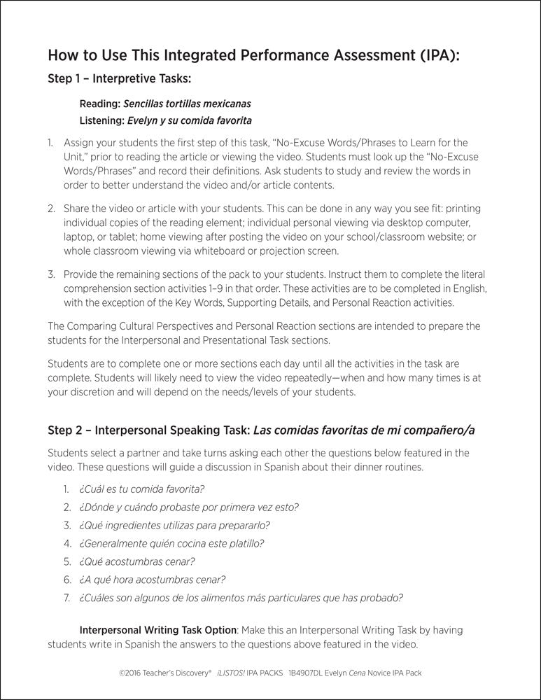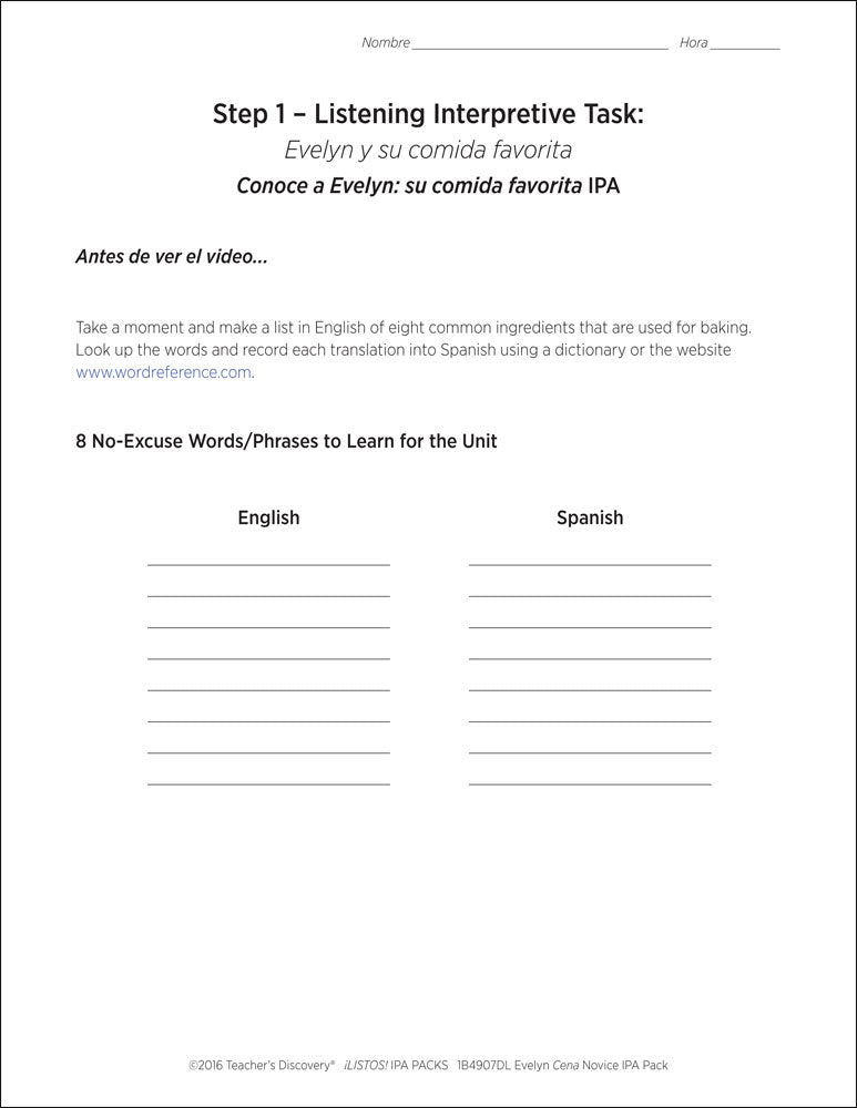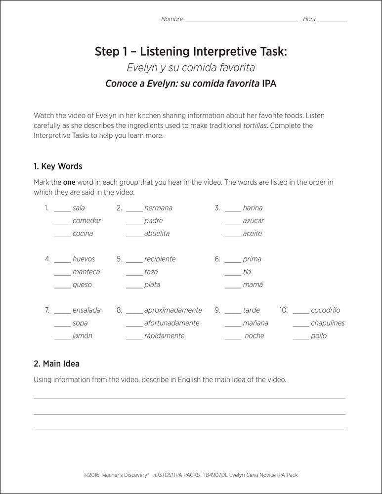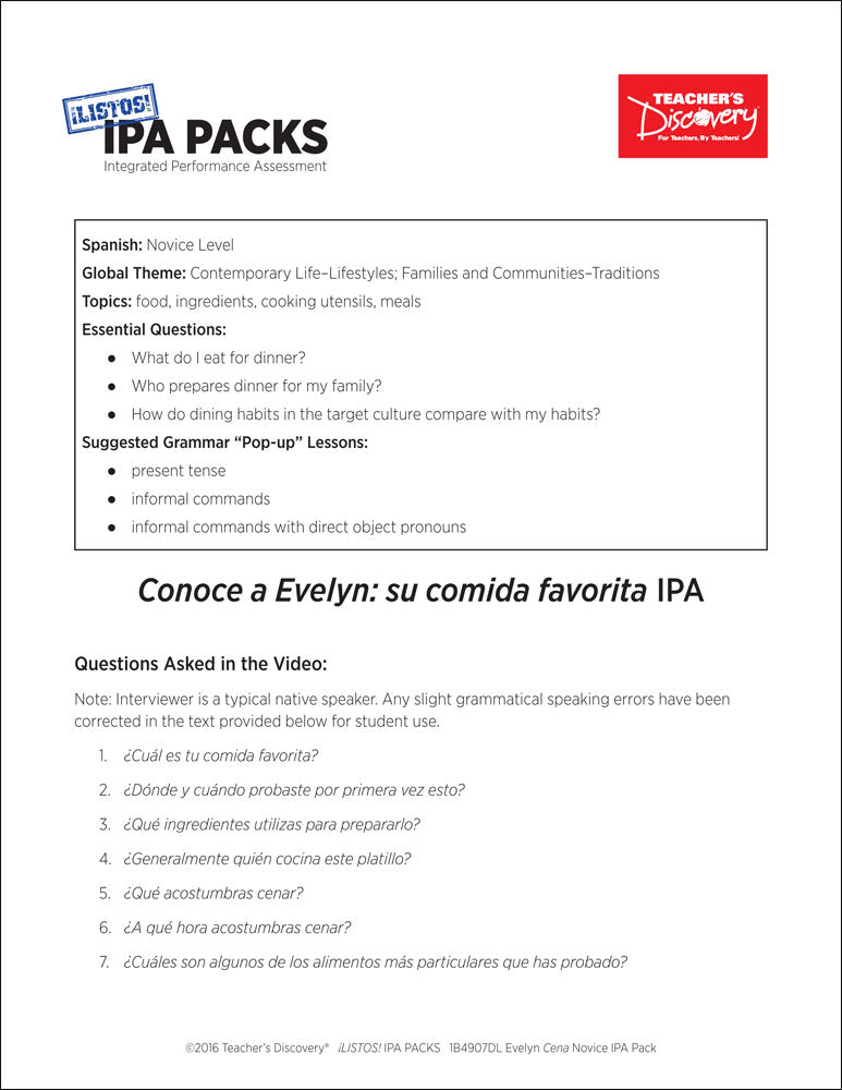 This ¡LISTOS! IPA Pack is based on two authentic resources: a traditional recipe and an exclusive two-minute video filmed in Mexico, of Evelyn preparing to make a traditional family dinner recipe and sharing information about it in 100% Spanish.