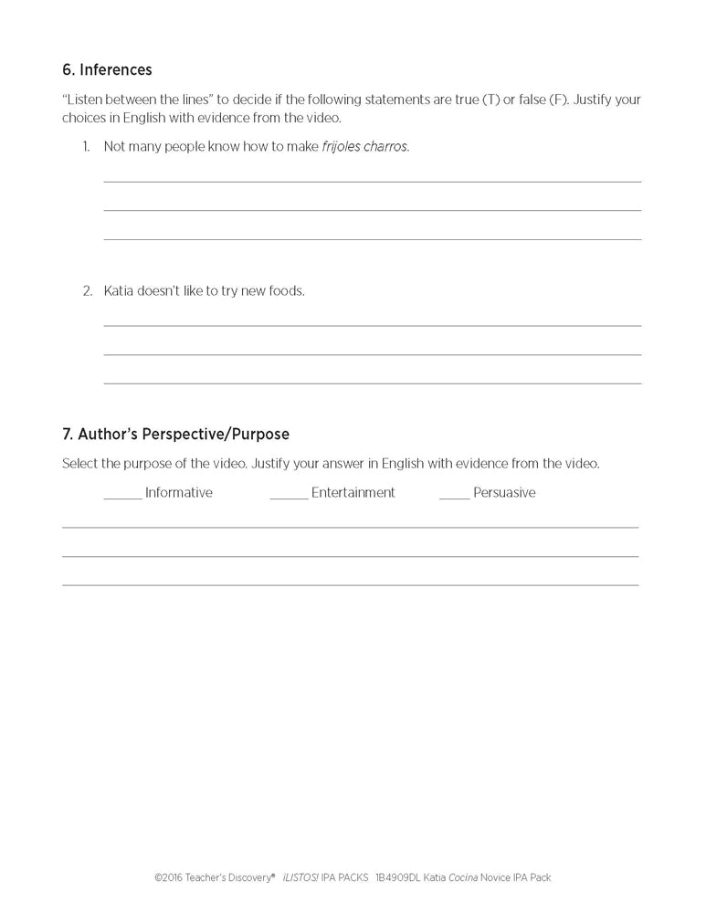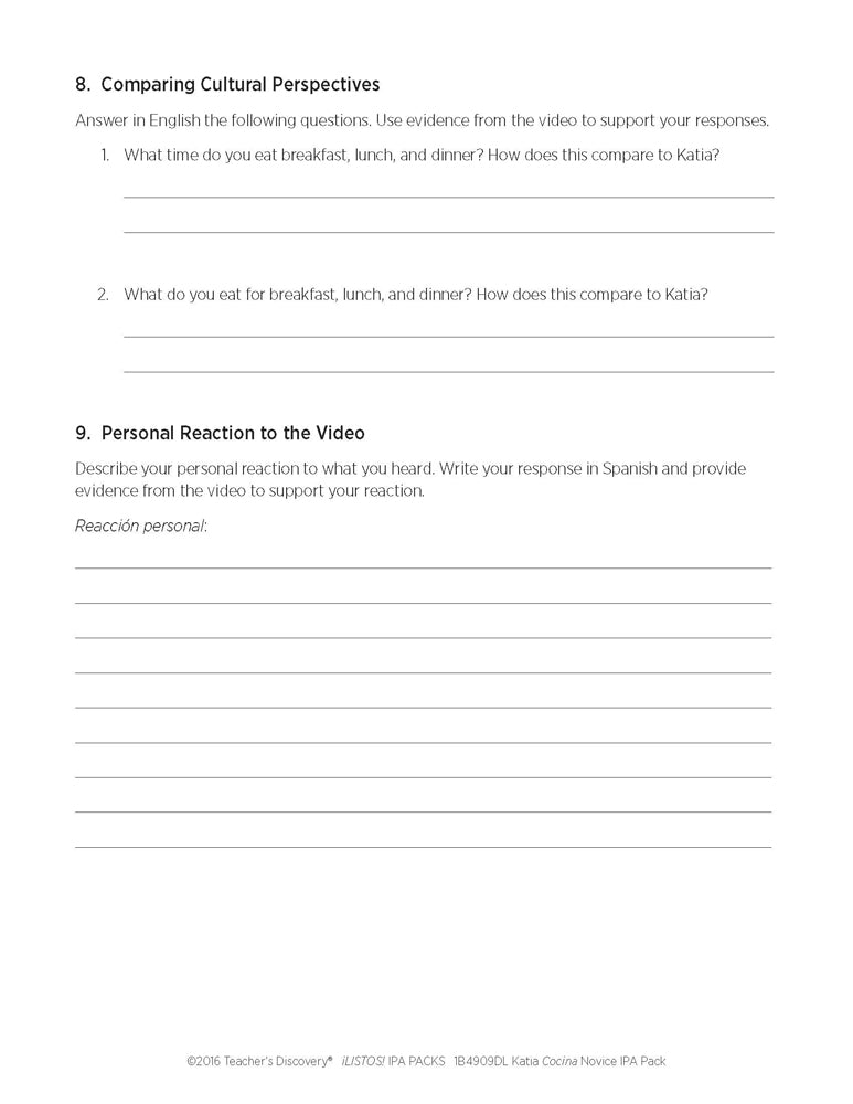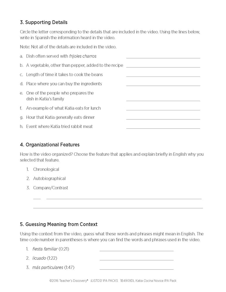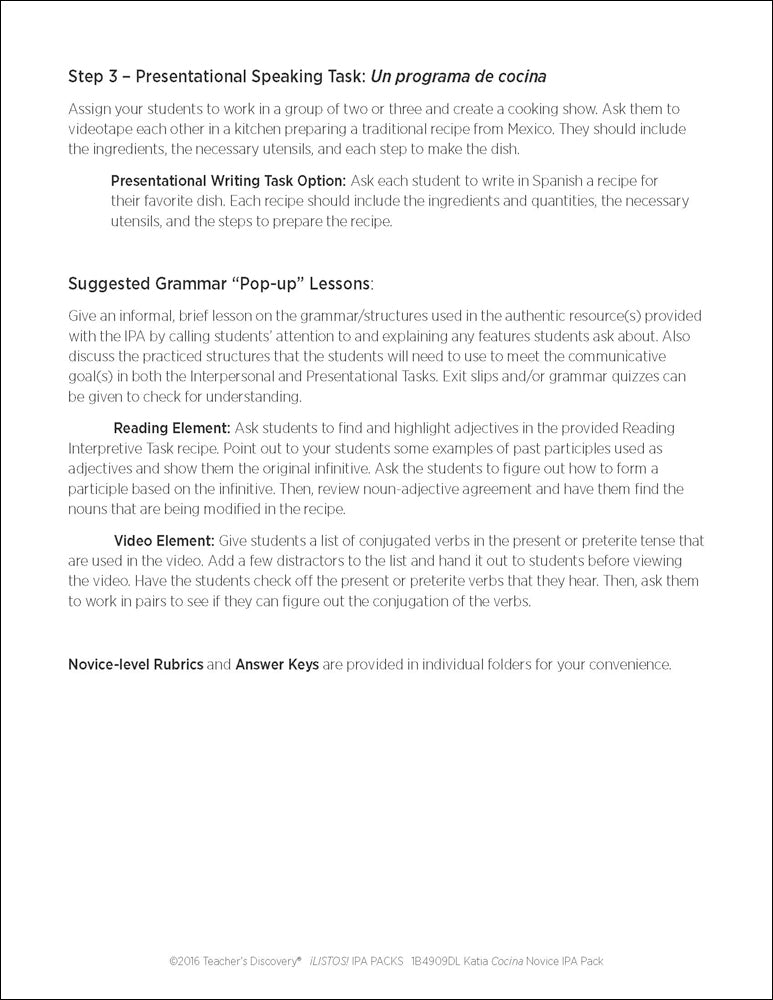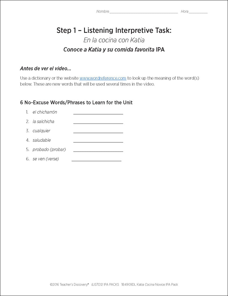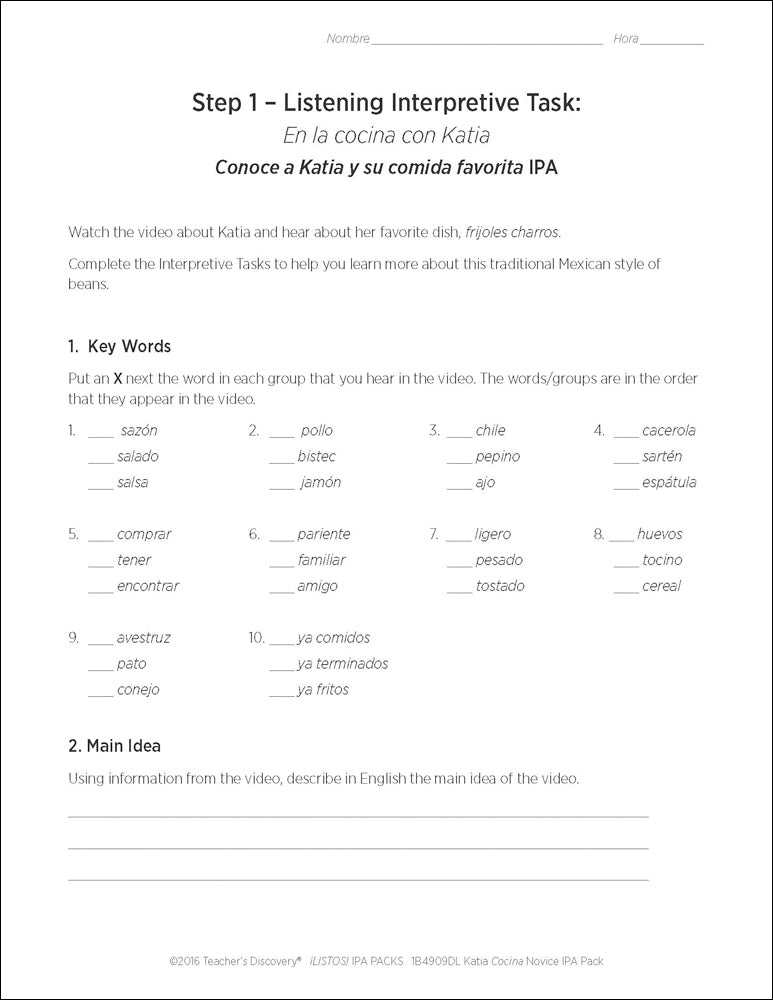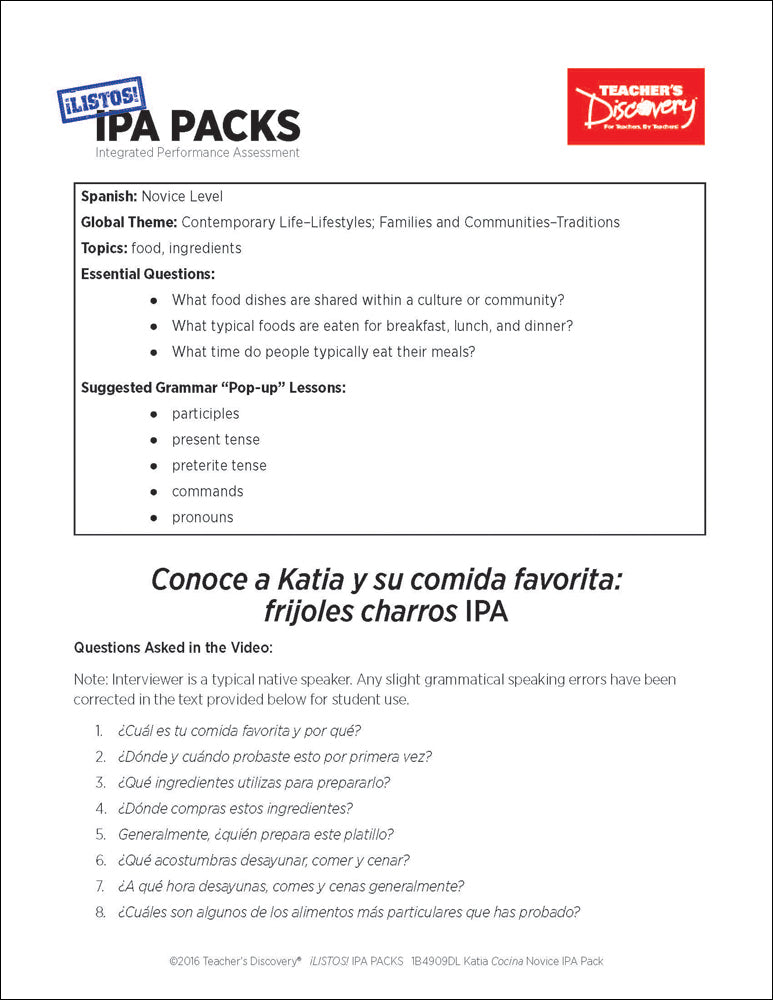 This ¡LISTOS! IPA Pack is based on two authentic resources: a traditional recipe and an exclusive two-minute video filmed in Mexico of Katia talking about a favorite family dinner and sharing information about it in 100% Spanish.