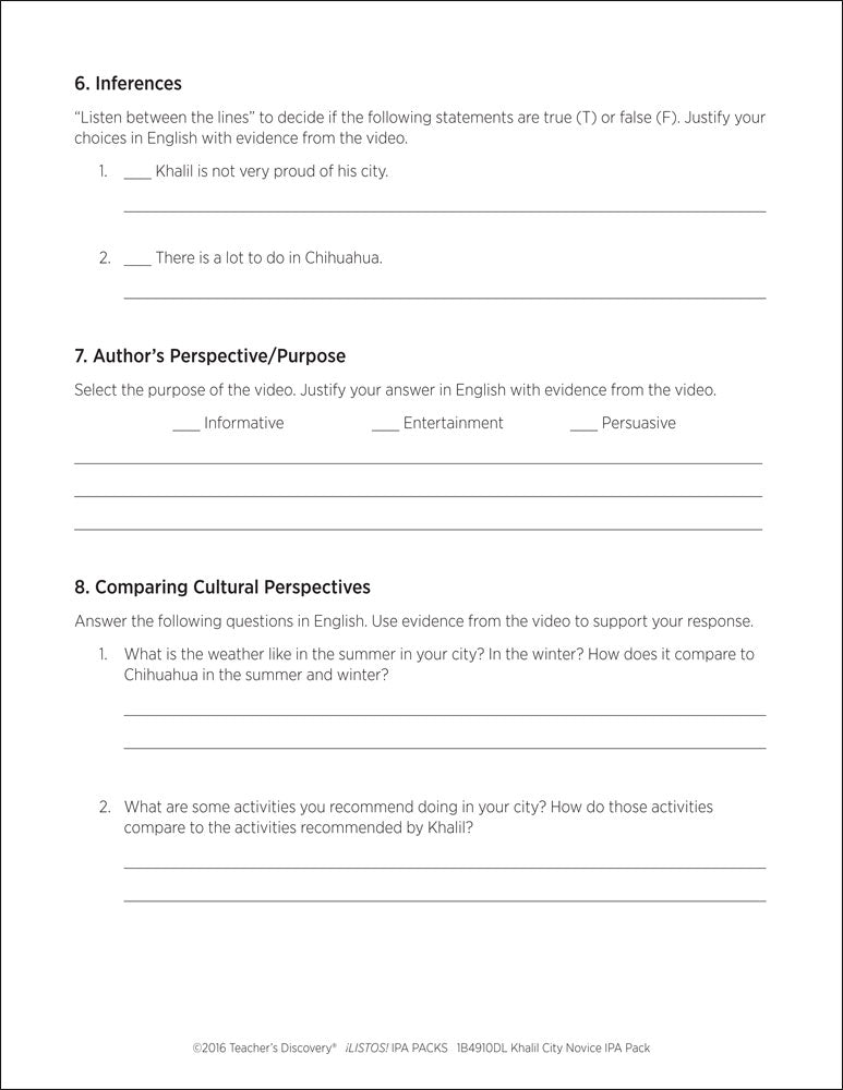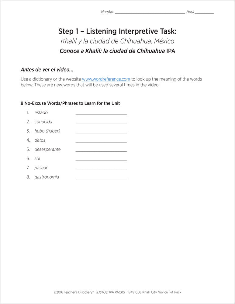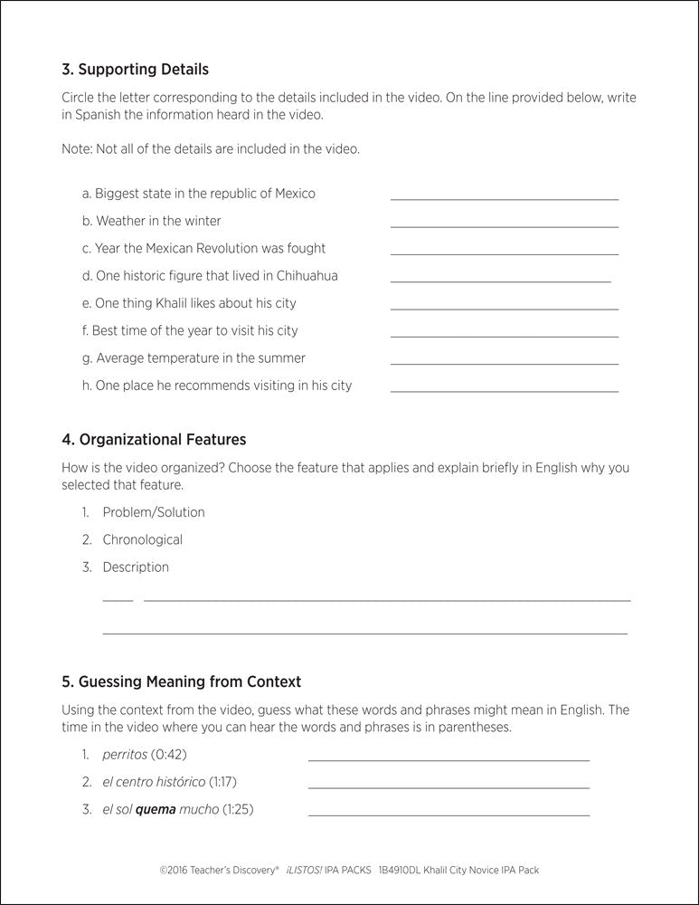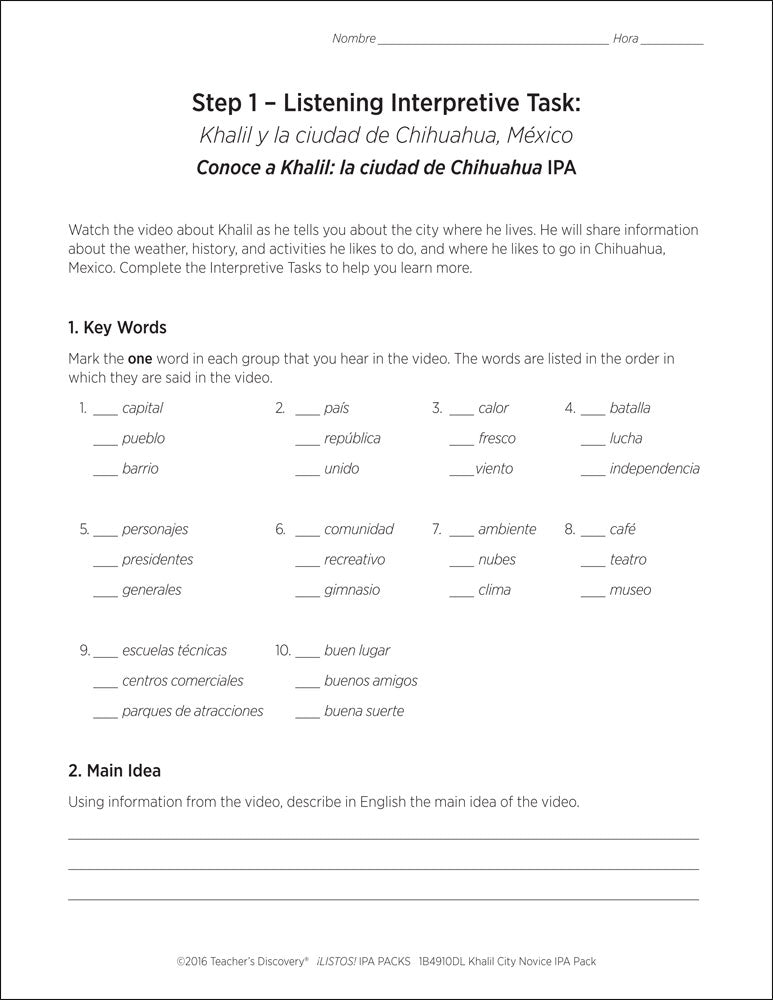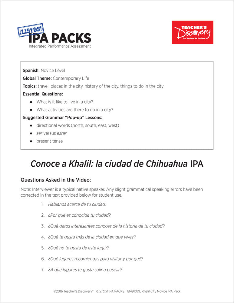 This ¡LISTOS! IPA Pack is based on two authentic resources; a map with legend and an exclusive two-minute video filmed in Mexico, of Khalil describing the city where he lives in Chihuahua, and the things he likes and doesn’t like to do in 100% Spanish.