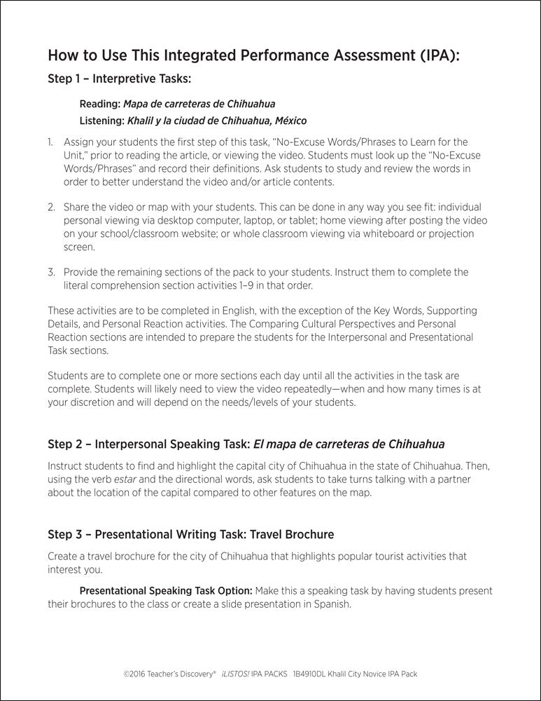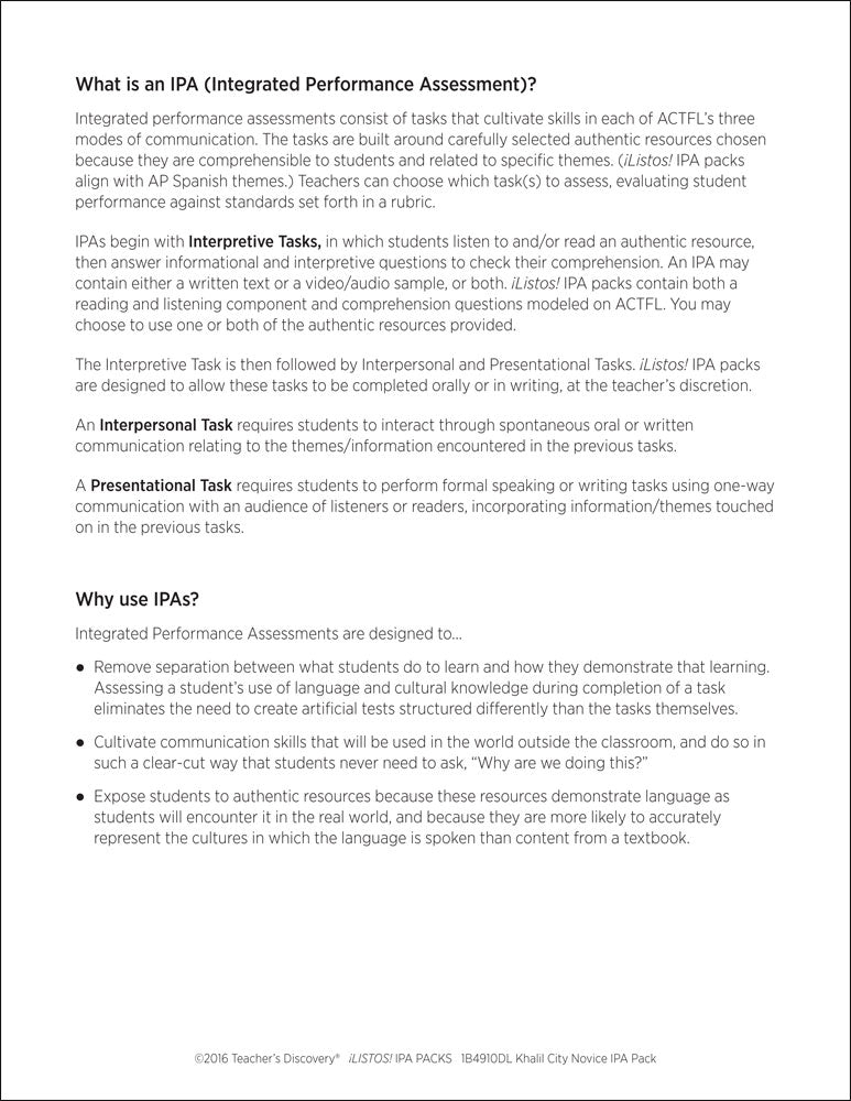 This pack includes step-by-step instructions, and reading and listening comprehension activities that follow the ACTFL model. Complete with an explanation of an IPA and how to use it, and nine Interpretive Tasks that break down the content, increase recognition of key words and phrases, develop context awareness, and promote language usage. In addition, it provides creative options for writing and/or speaking Interpersonal and Presentational Tasks, answer keys, and novice-level rubrics for each mode.