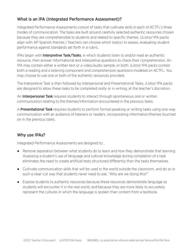 This pack includes step-by-step instructions, and reading and listening comprehension activities that follow the ACTFL model. Complete with an explanation of an IPA and how to use it, and nine Interpretive Tasks that break down the content, increase recognition of key words and phrases, develop context awareness, and promote language usage. In addition, it provides creative options for writing and/or speaking Interpersonal and Presentational Tasks, answer keys, and rubrics for each mode.