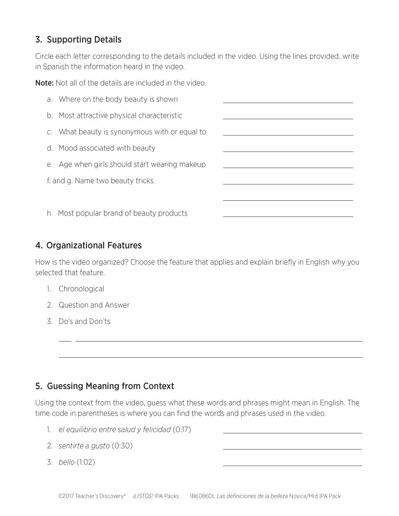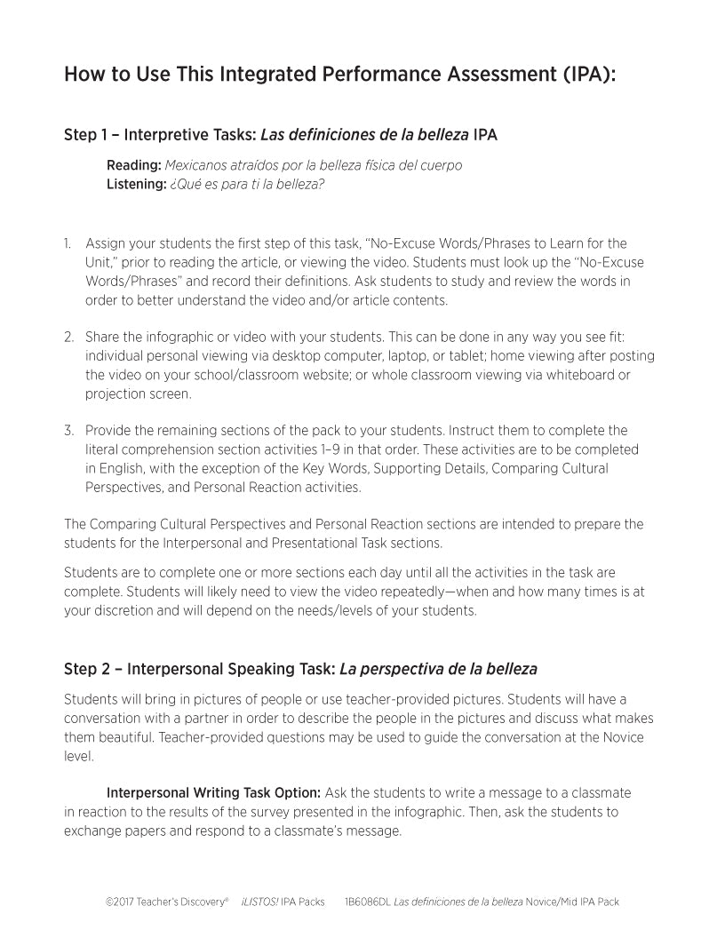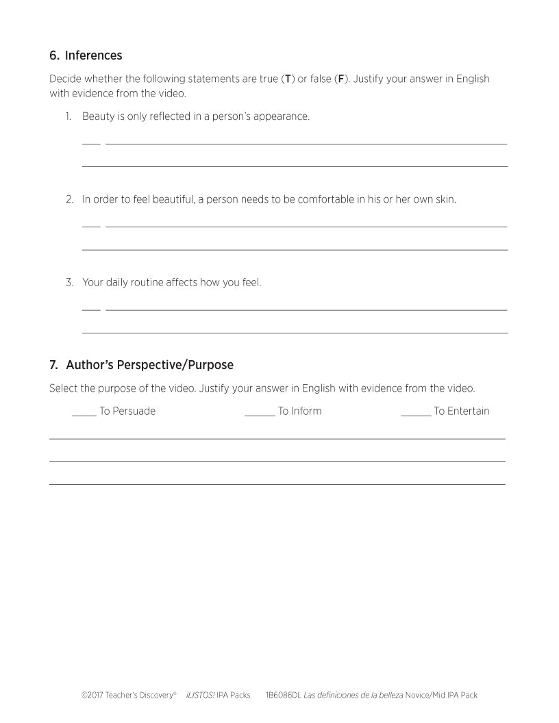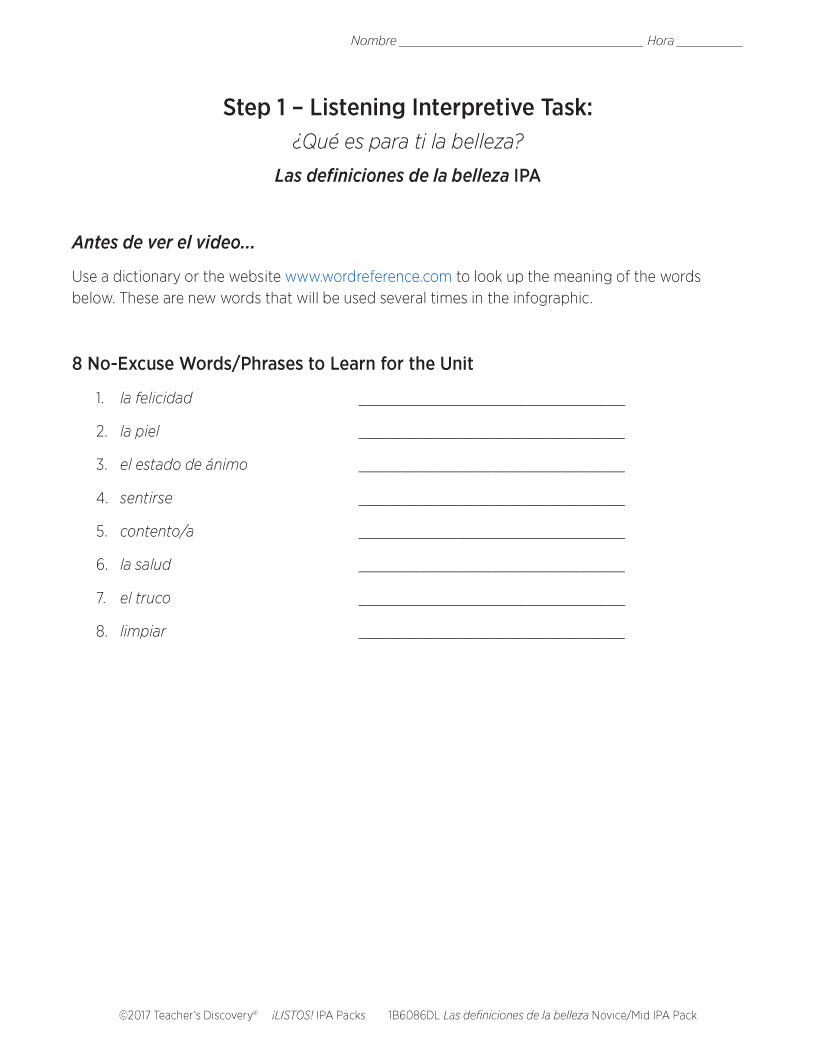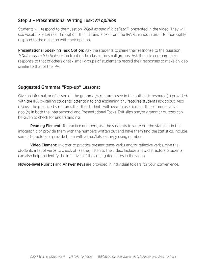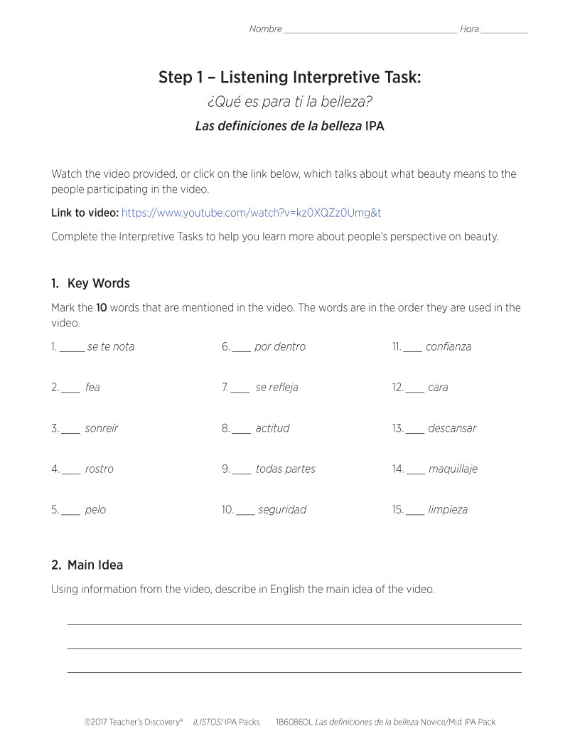 This ¡LISTOS! IPA Pack Download is based on two authentic resources: an infographic and a two-minute video which talks about what beauty means to the people participating in the video entirely in Spanish.