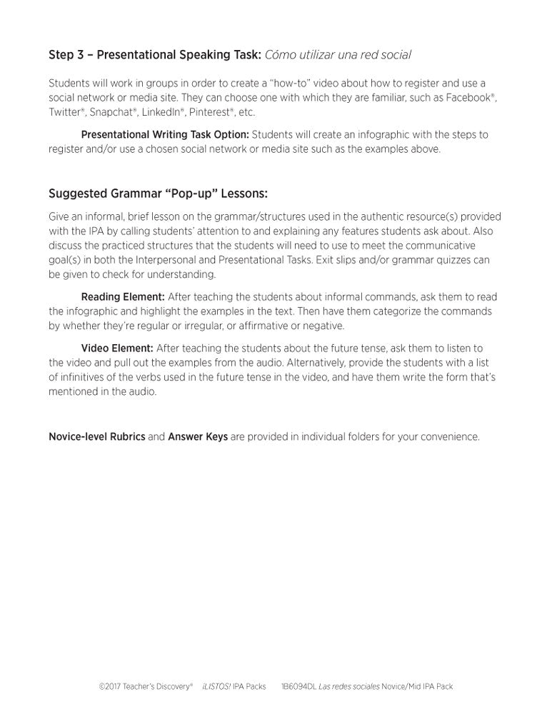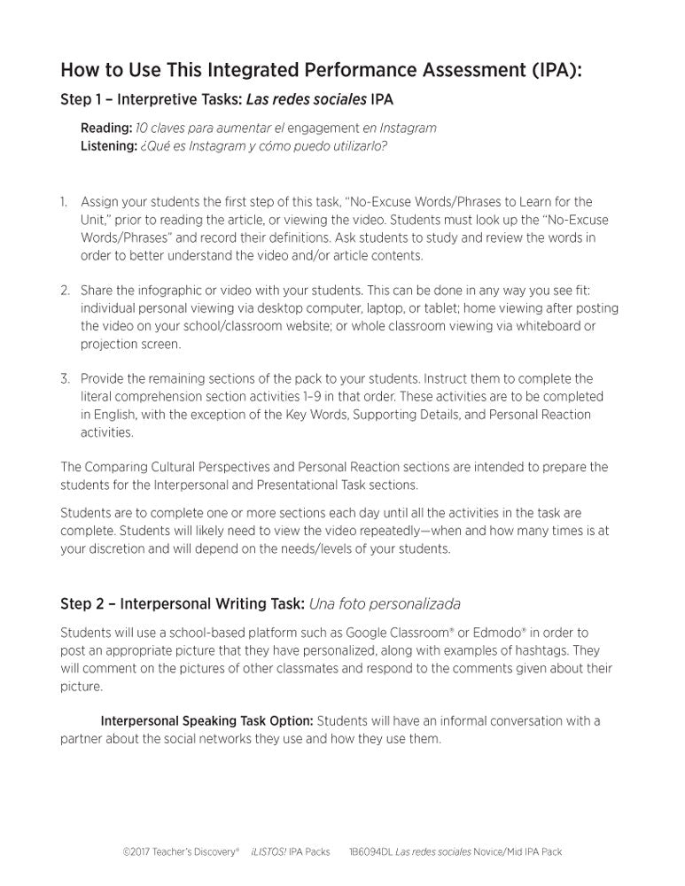 This pack includes step-by-step instructions, and reading and listening comprehension activities that follow the ACTFL model. Complete with an explanation of an IPA and how to use it, and nine Interpretive Tasks that break down the content, increase recognition of key words and phrases, develop context awareness, and promote language usage. In addition, it provides creative options for writing and/or speaking Interpersonal and Presentational Tasks, answer keys, and rubrics for each mode.