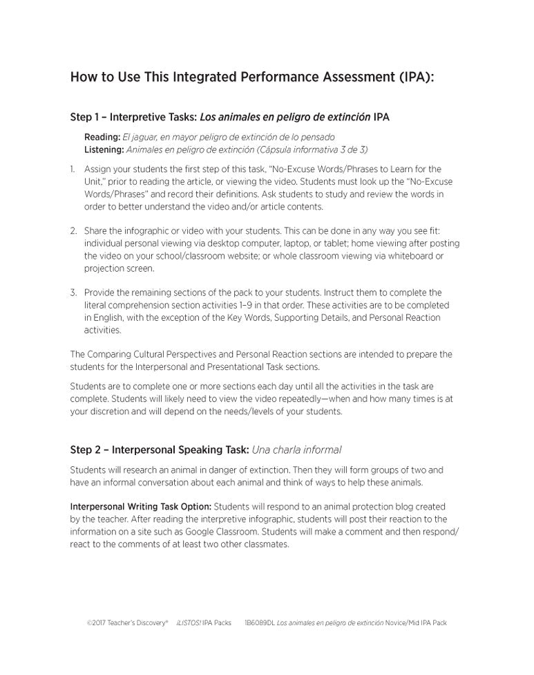 This pack includes step-by-step instructions, and reading and listening comprehension activities that follow the ACTFL model. Complete with an explanation of an IPA and how to use it, and nine Interpretive Tasks that break down the content, increase recognition of key words and phrases, develop context awareness, and promote language usage. In addition, it provides creative options for writing and/or speaking Interpersonal and Presentational Tasks, answer keys, and rubrics for each mode.