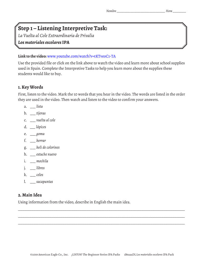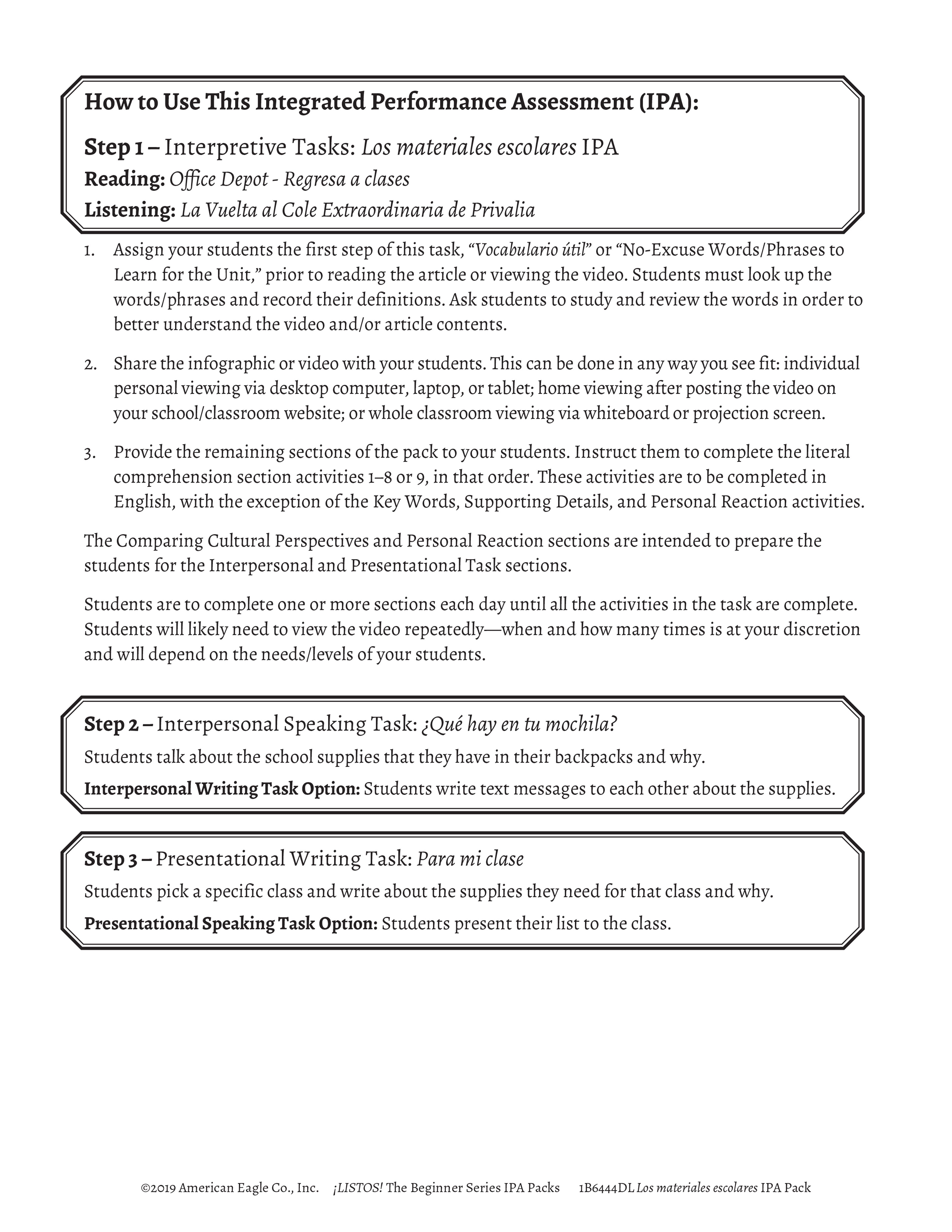 This pack includes step-by-step instructions, and reading and listening comprehension activities that follow the ACTFL model. It is complete with an explanation of an IPA and how to use it, and nine Interpretive Tasks that break down the content, increase recognition of key words and phrases, develop context awareness, and promote language usage. In addition, it provides creative options for writing and/or speaking Interpersonal and Presentational Tasks, answer keys, and rubrics for each mode.