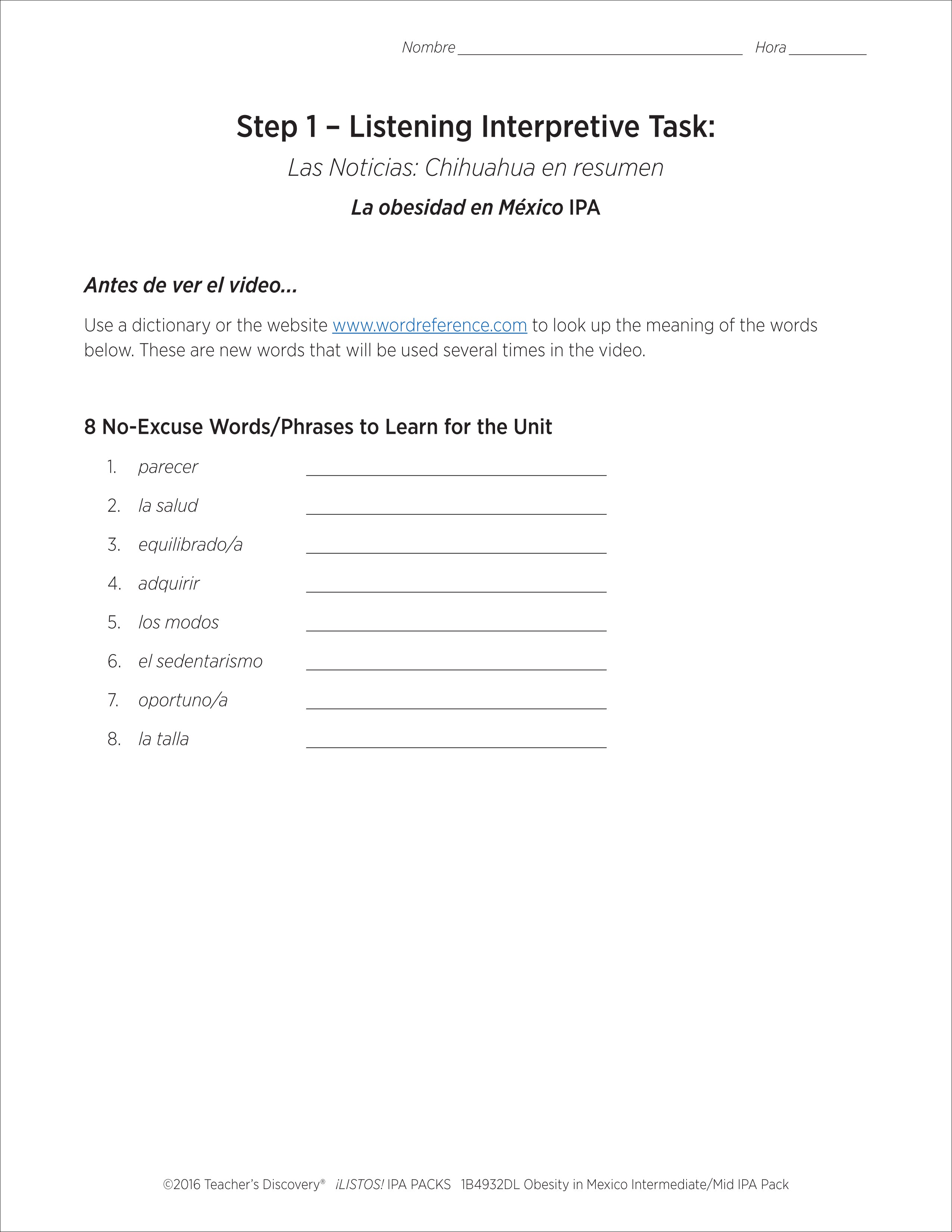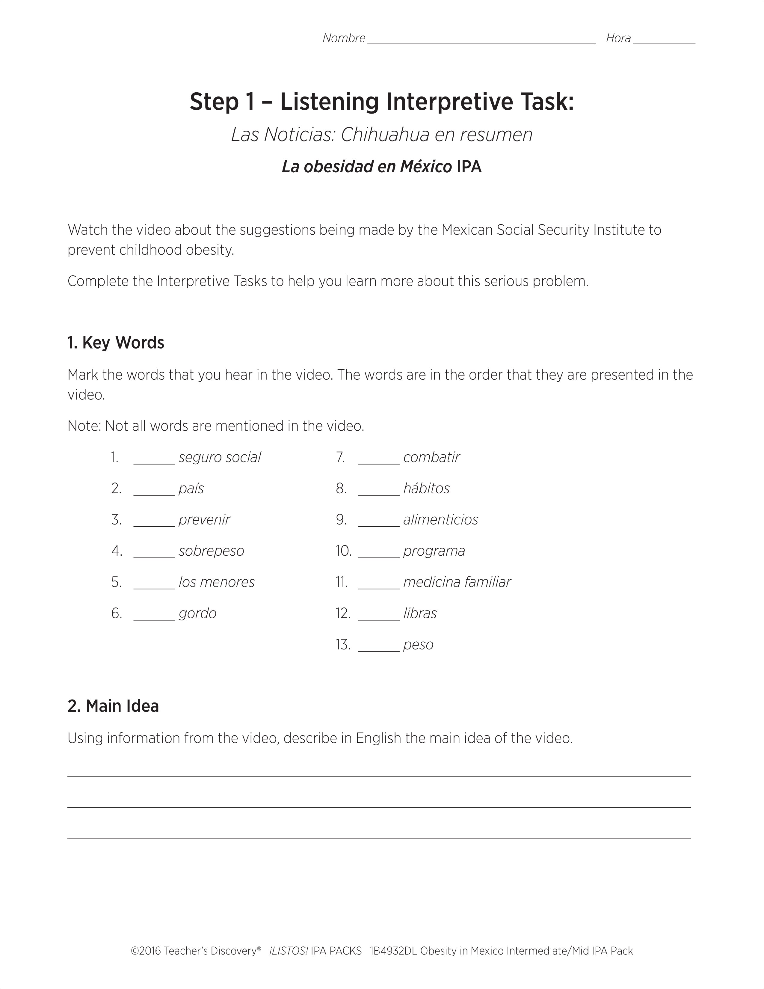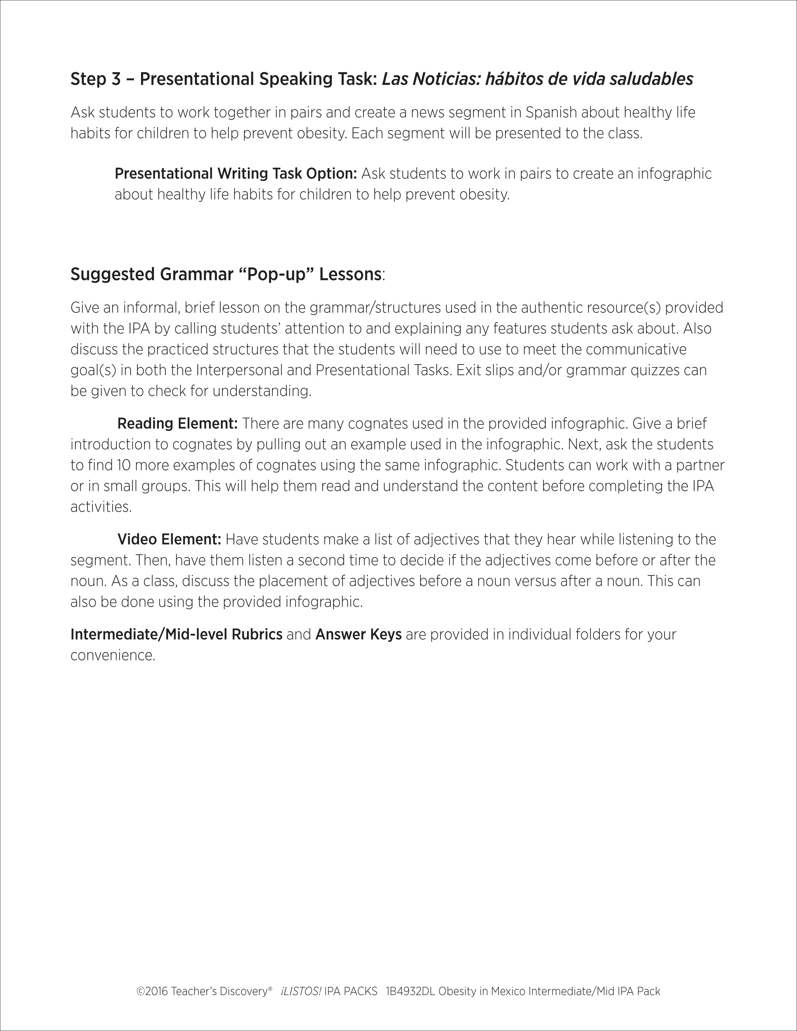 This ¡LISTOS! IPA Pack is based on two authentic resources: an infographic chart and authentic news story with suggestions by the Mexican Social Security Institute to prevent childhood obesity in 100% Spanish.