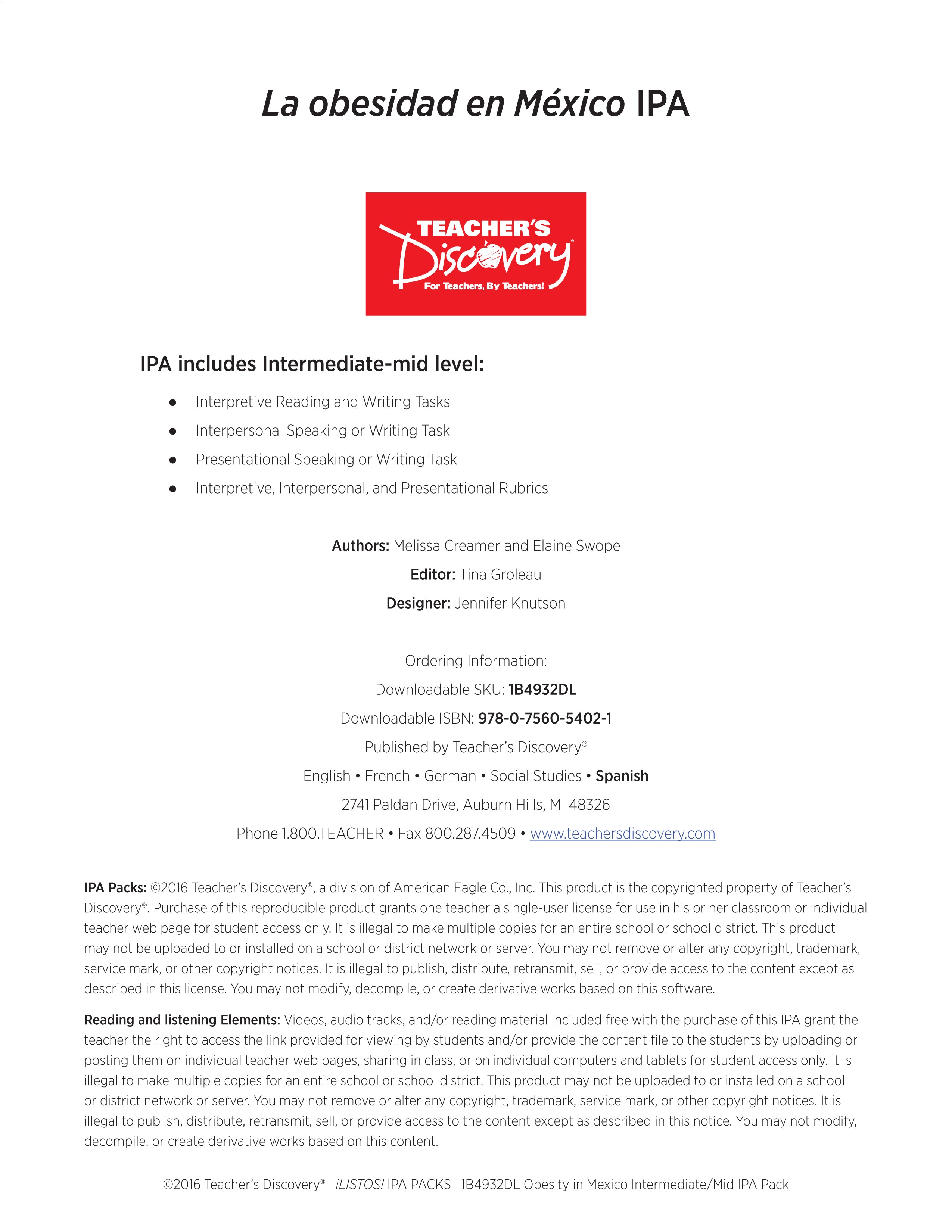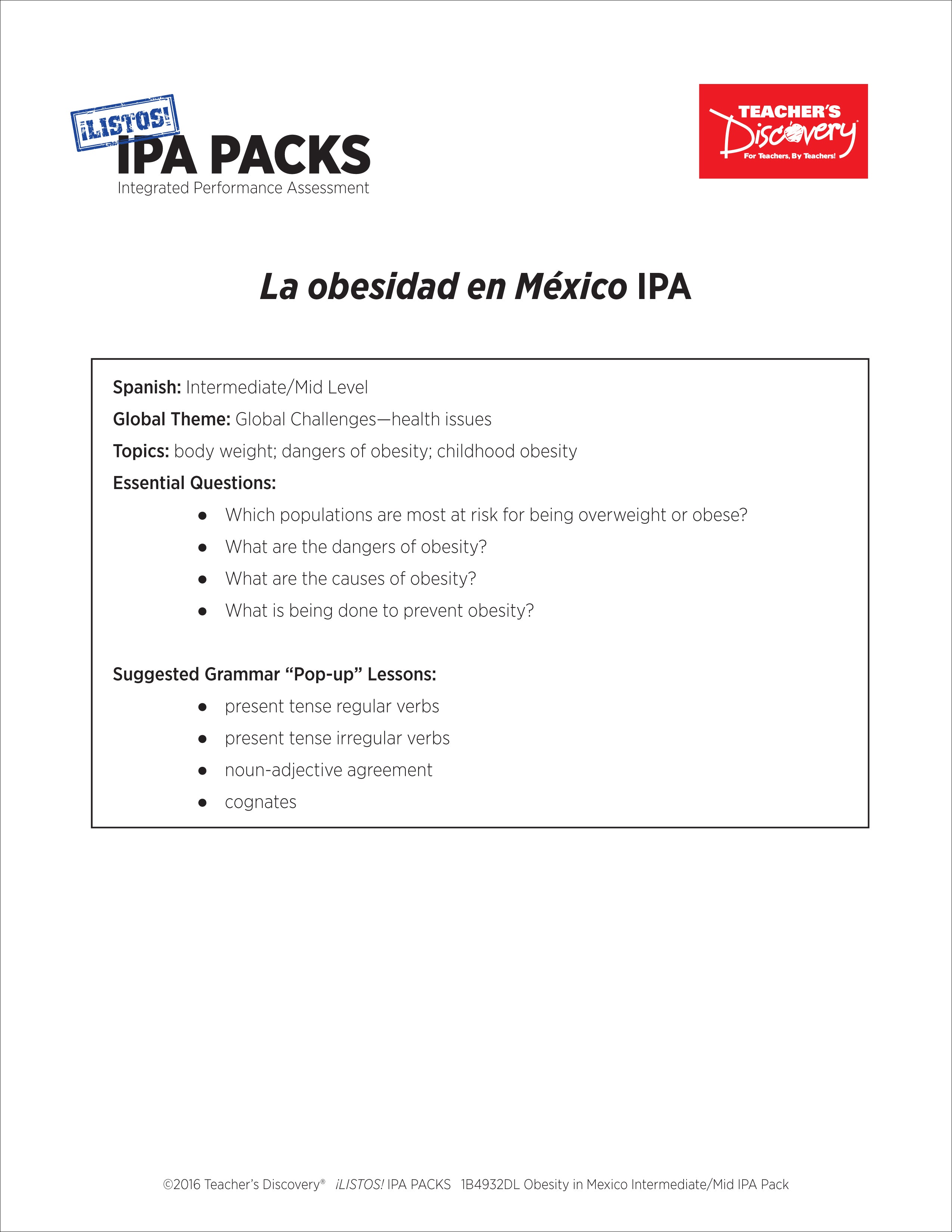 Obesity in Mexico Intermediate-Low Spanish IPA Pack - DIGITAL RESOURCE DOWNLOAD