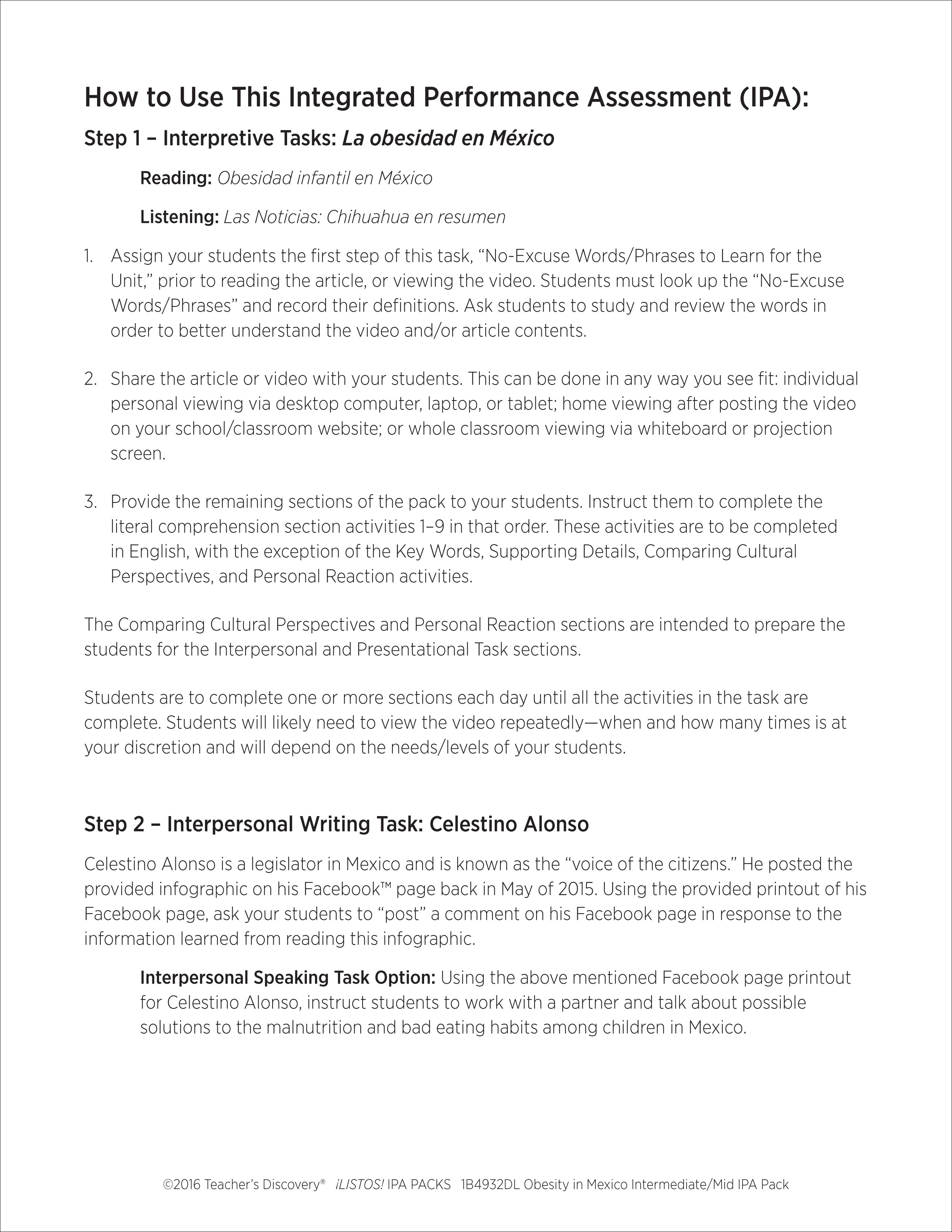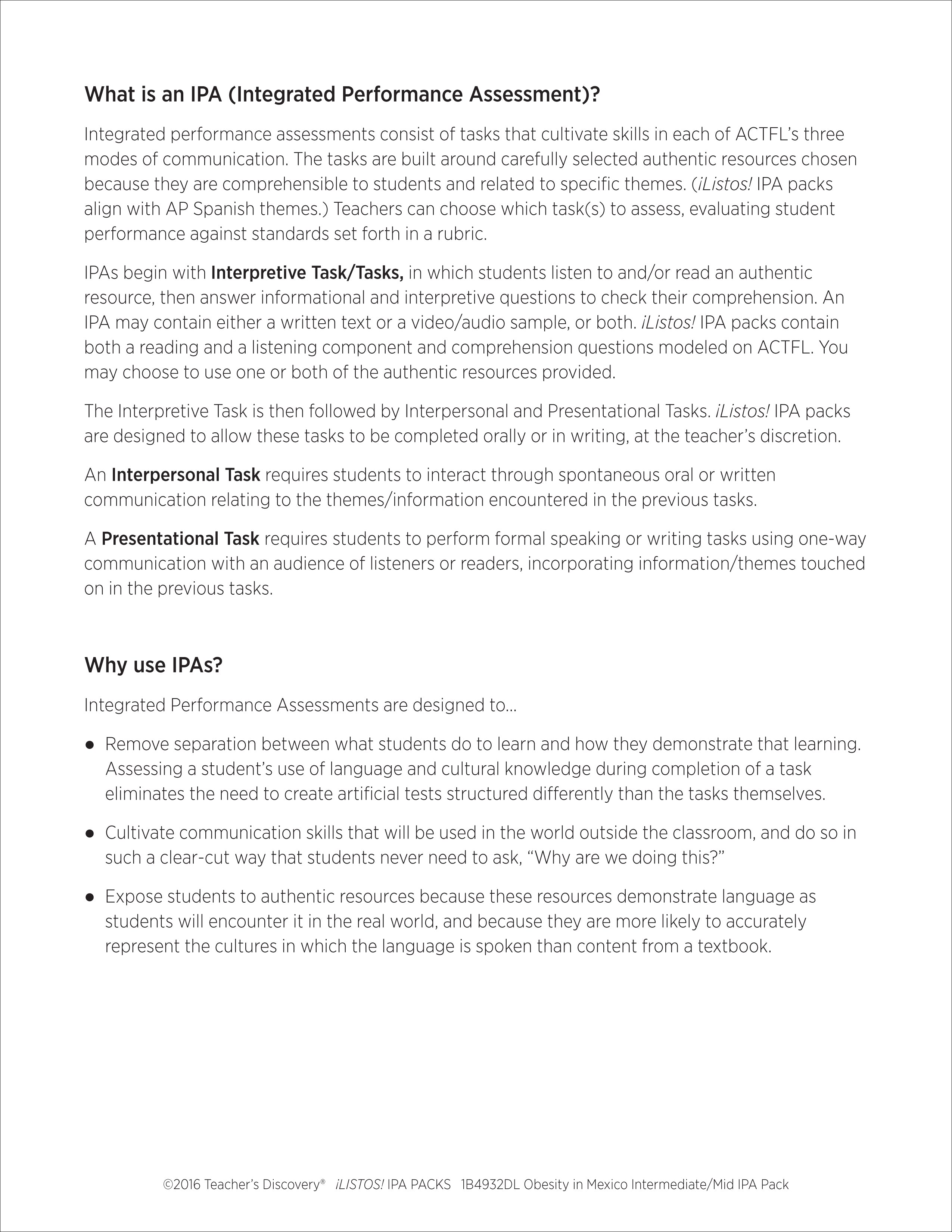 This pack includes step-by-step instructions, and reading and listening comprehension activities that follow the ACTFL model. Complete with an explanation of an IPA and how to use it, and nine Interpretive Tasks that break down the content, increase recognition of key words and phrases, develop context awareness, and promote language usage. In addition, it provides creative options for writing and/or speaking Interpersonal and Presentational Tasks, answer keys, and intermediate-level rubrics for each mode.
