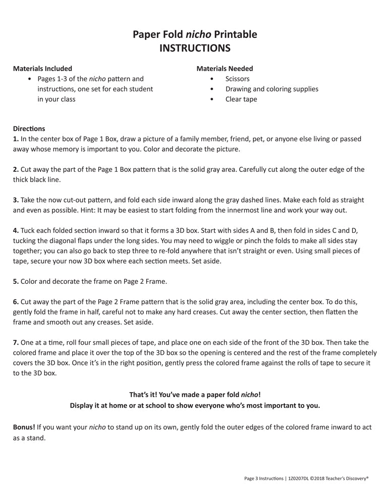 A nicho is a three-dimensional display used to honor a loved one or important figure, or their memory. Let your students show you who's most important to them with 3D paper fold nichos. All you need is this downloadable, printable PDF pattern with instructions—plus scissors, drawing and coloring supplies, and tape. Reproducible, pattern prints on standard 8 x 11-inch paper.